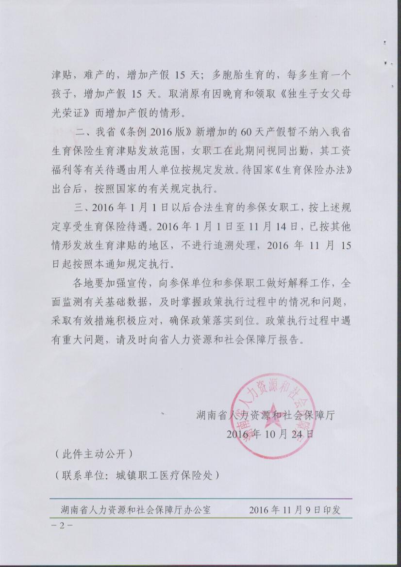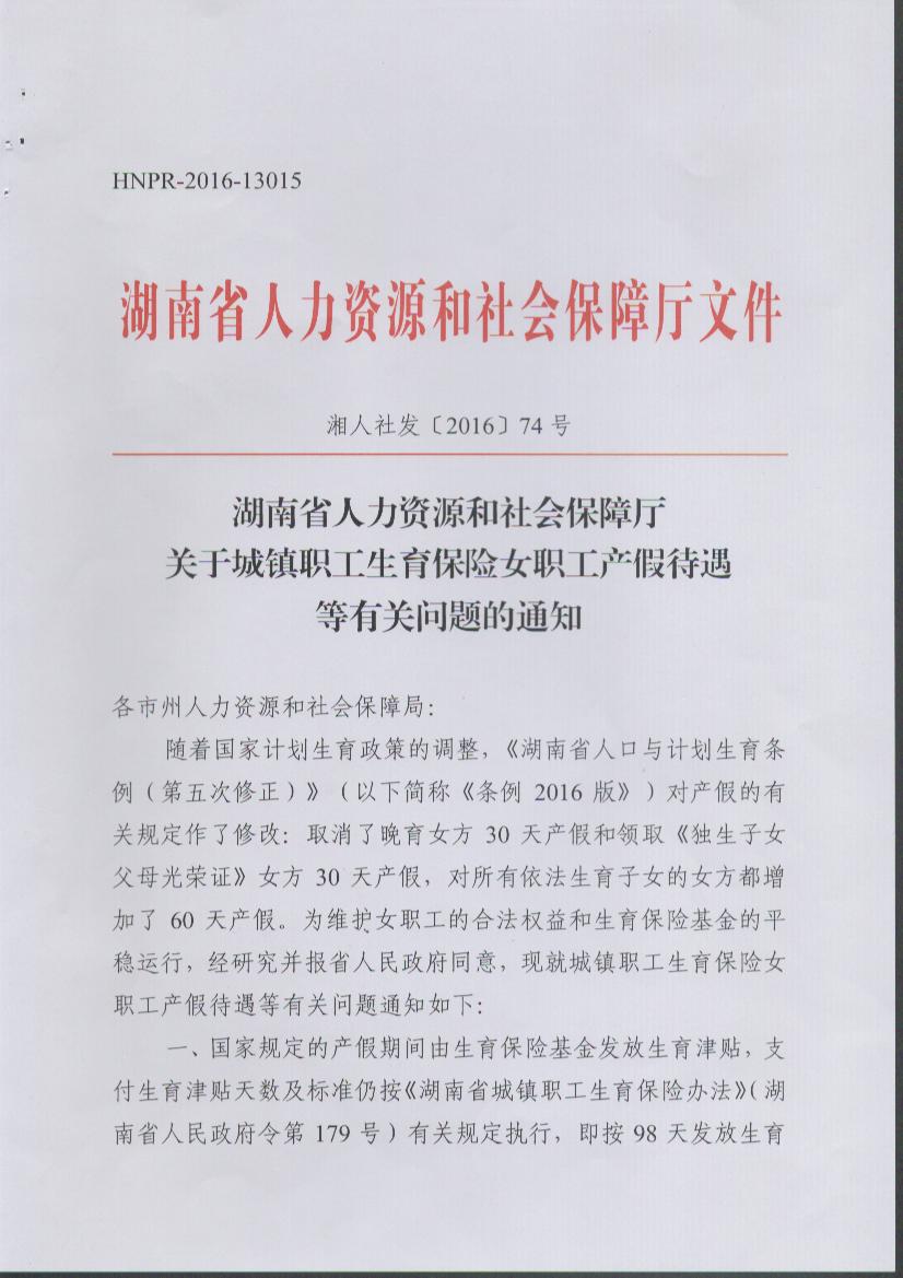转发湖南省人力资源和社会保障厅关于城镇职工生育保险女职工产假待遇等有关问题的通知