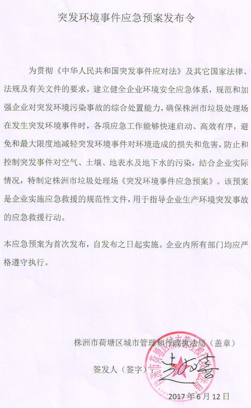 突发环境事件应急预案发布令