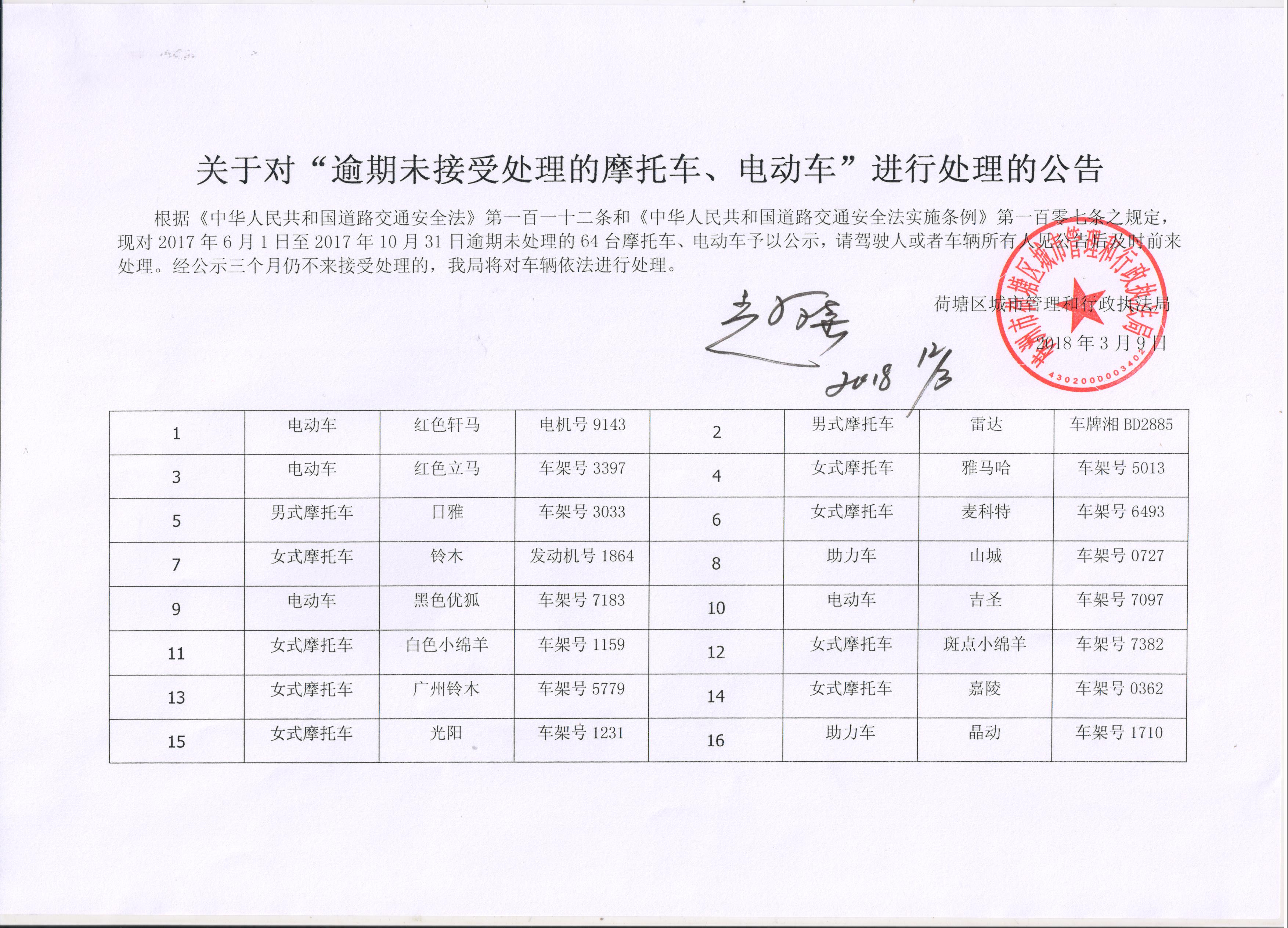 关于对暂扣摩托车、电动车逾期未接受处理的公告