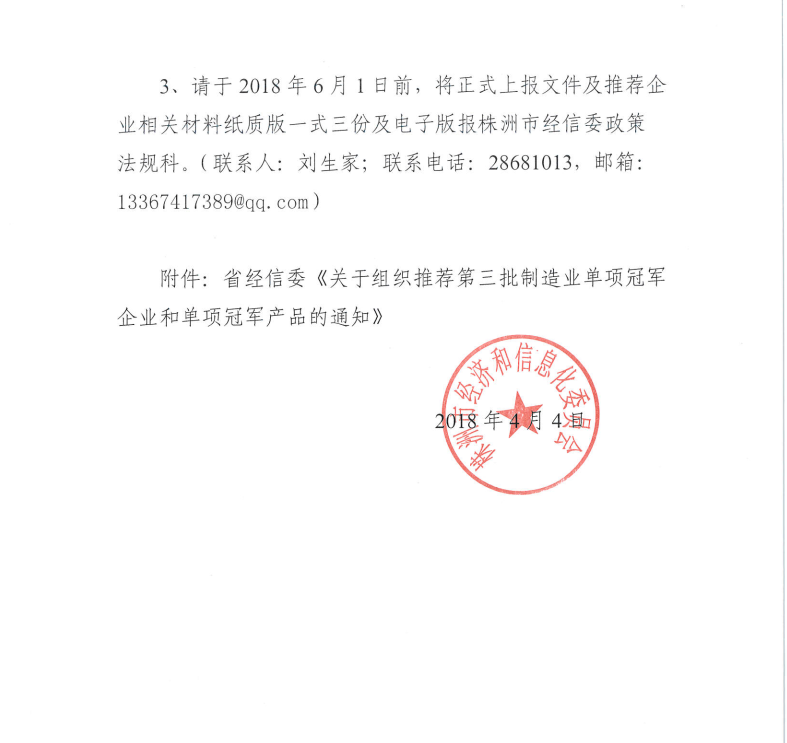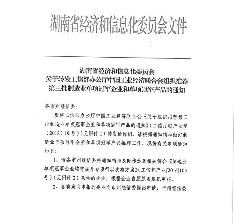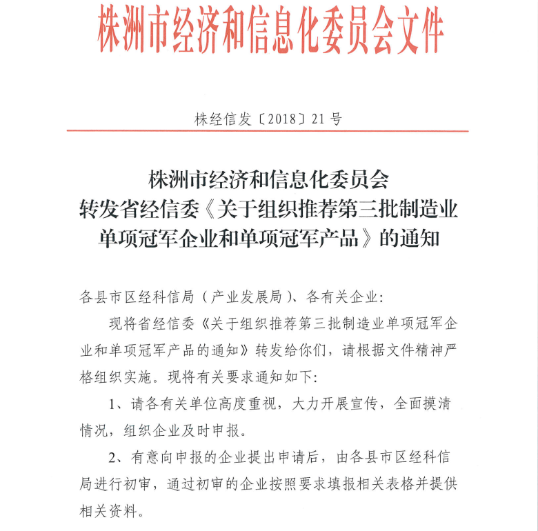 关于组织推荐第三批制造业单项冠军企业和单项冠军产品的通知--株经信发(2018)21号 (1)