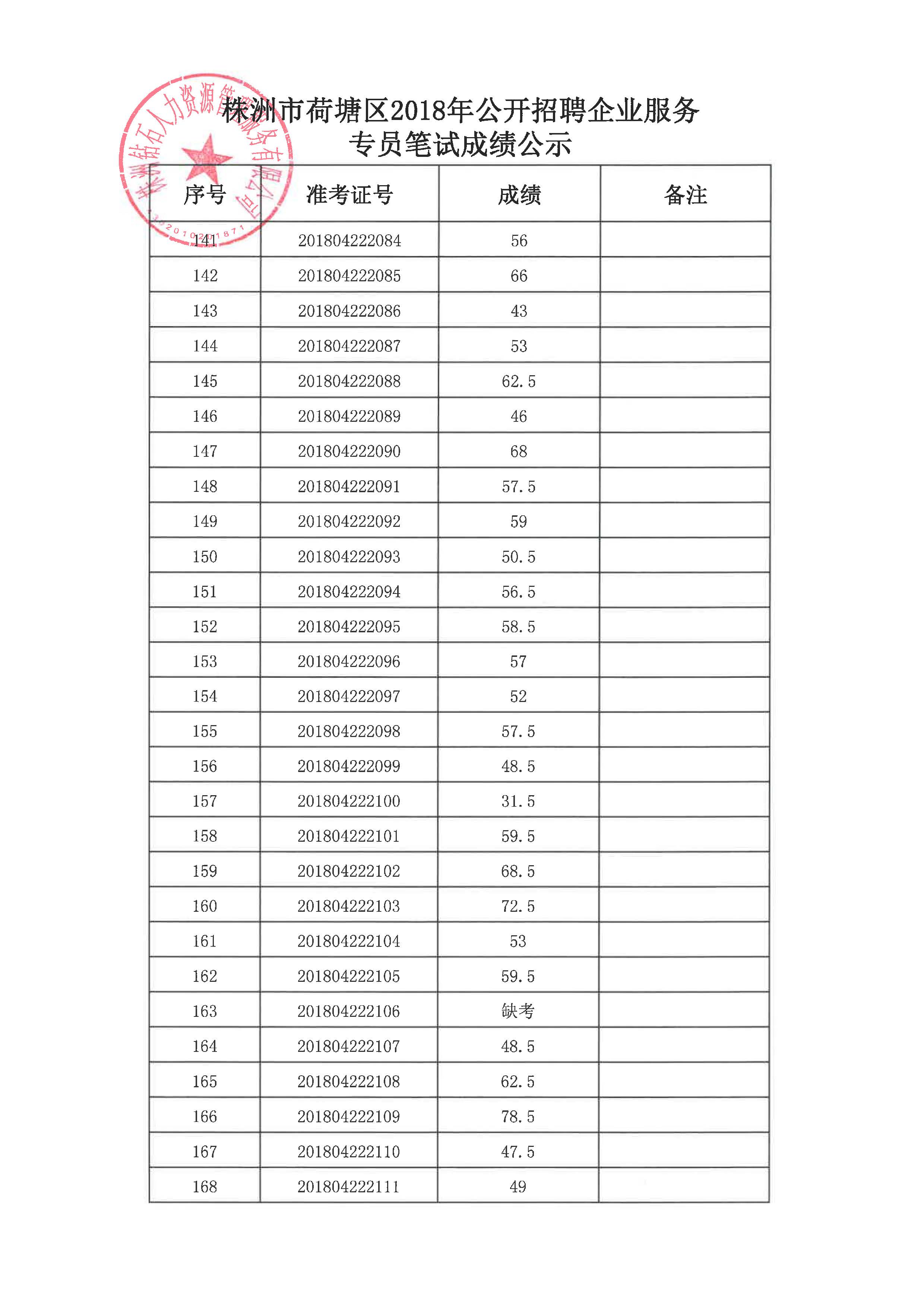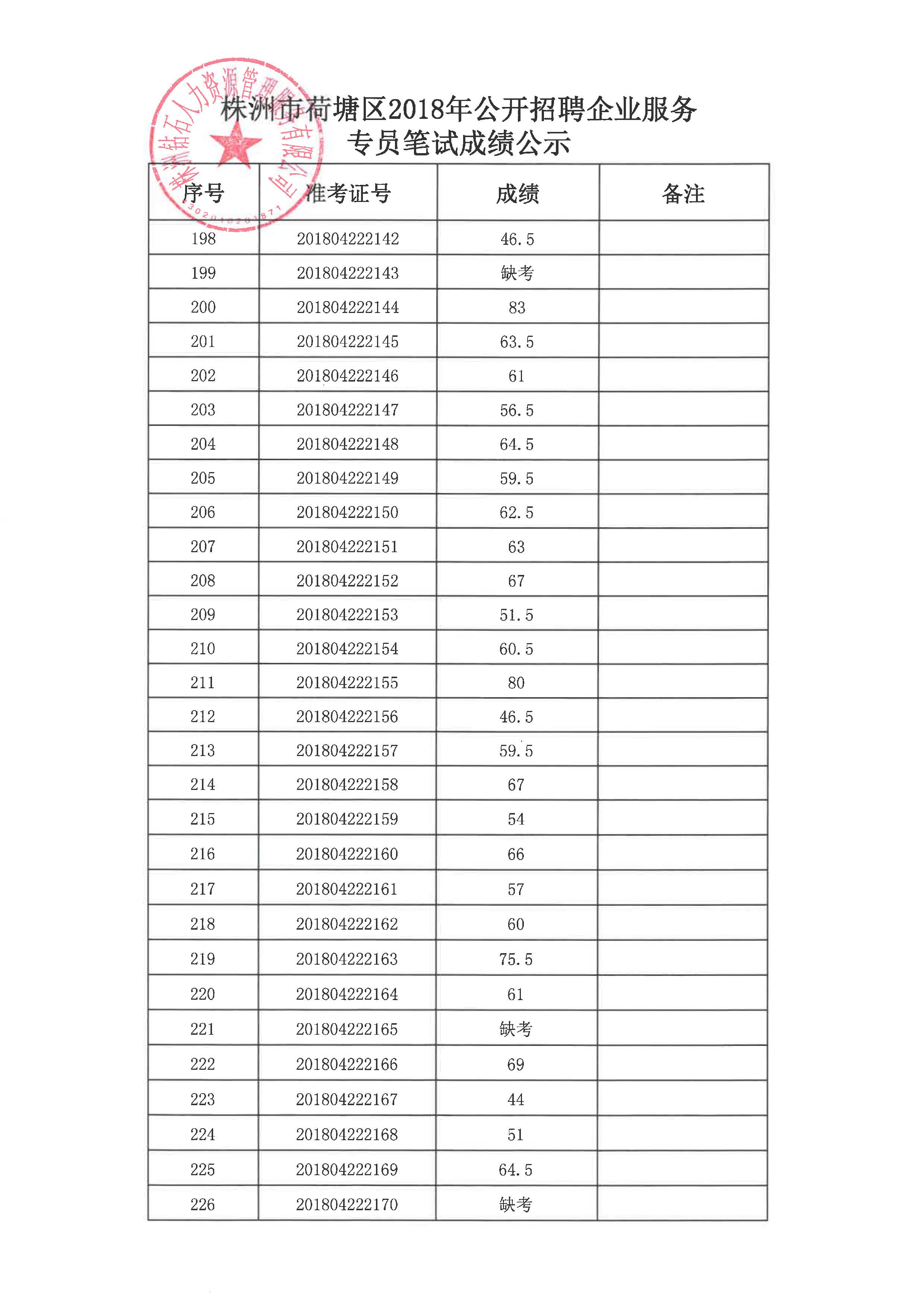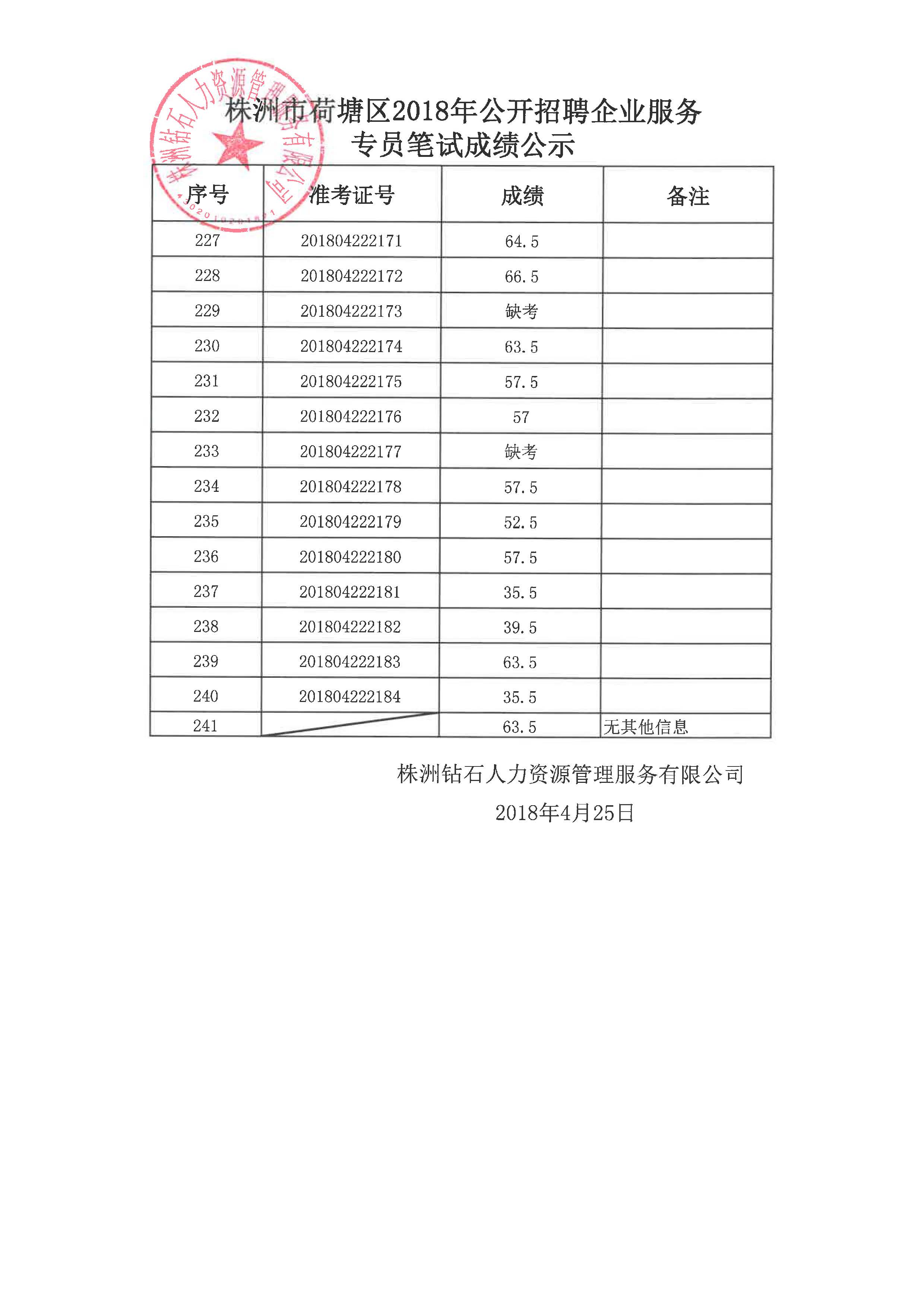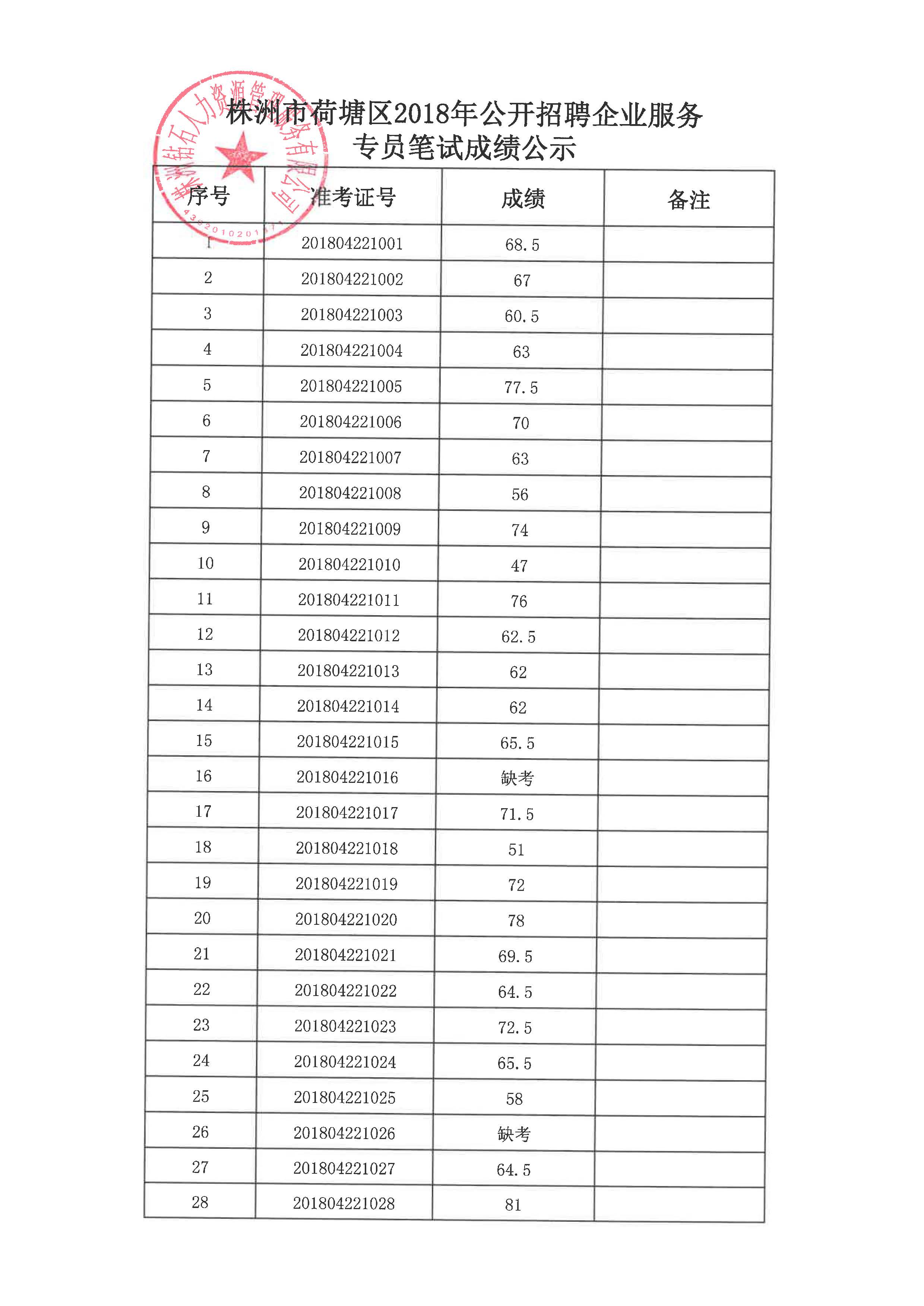 根据《2018年荷塘区企业服务专员招聘公告》(2018年4月12日发布),经公开报名、资格审核、笔试,株洲钻石人力资源管理服务有限公司于4月28日组织入围的考生进行了面试,现将面试成绩、综合成绩、体检入围名单予以公示。
