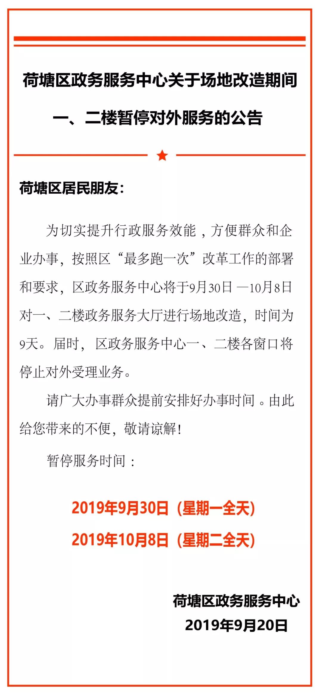 荷塘区政务服务中心关于场地改造期间一、二楼暂停对外服务的公告