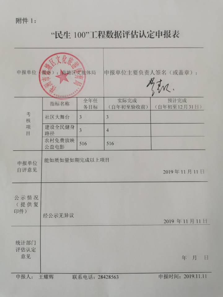按照株洲市统计局《关于认真做好2019年全市"民生100"工程考核数据评估认定工作的通知》(株统计通〔2019〕37号)要求,已完成农村免费放映公益电影516场,现将我局承办的2019年"民生100"工程项目完成情况予以公示。