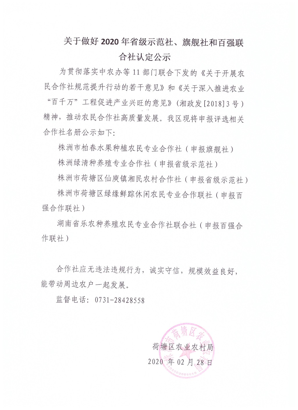 关于做好2020年省级示范社、旗舰社和百强联合社认定公示