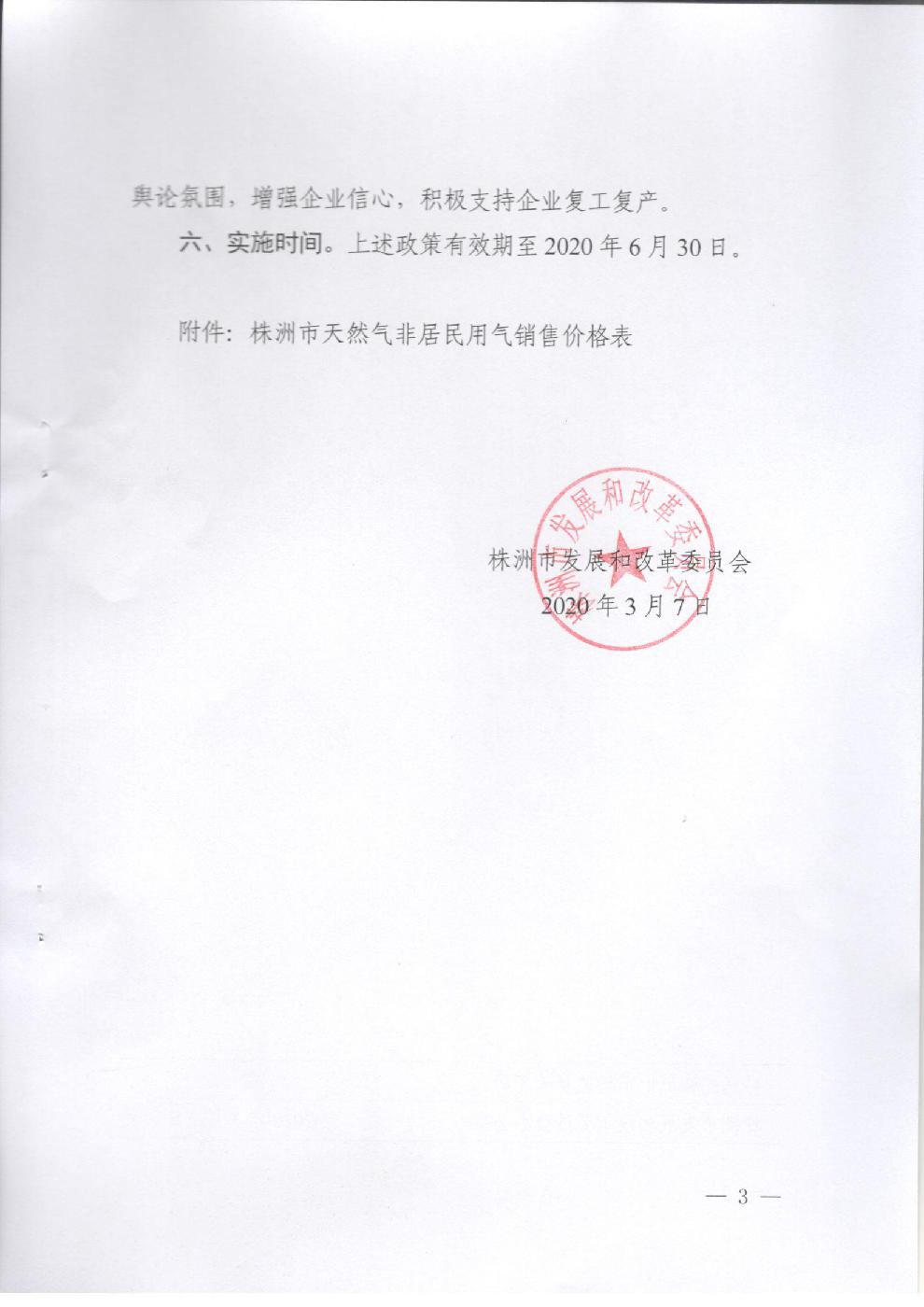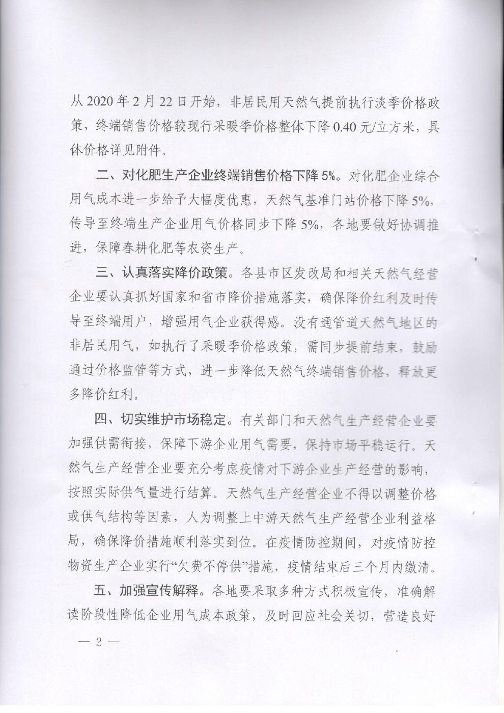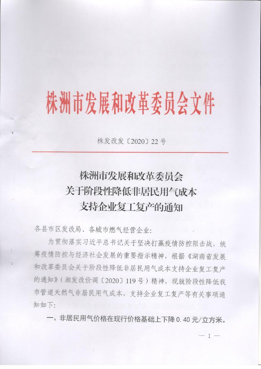 关于阶段性降低非居民用气成本支持企业复工复产的通知