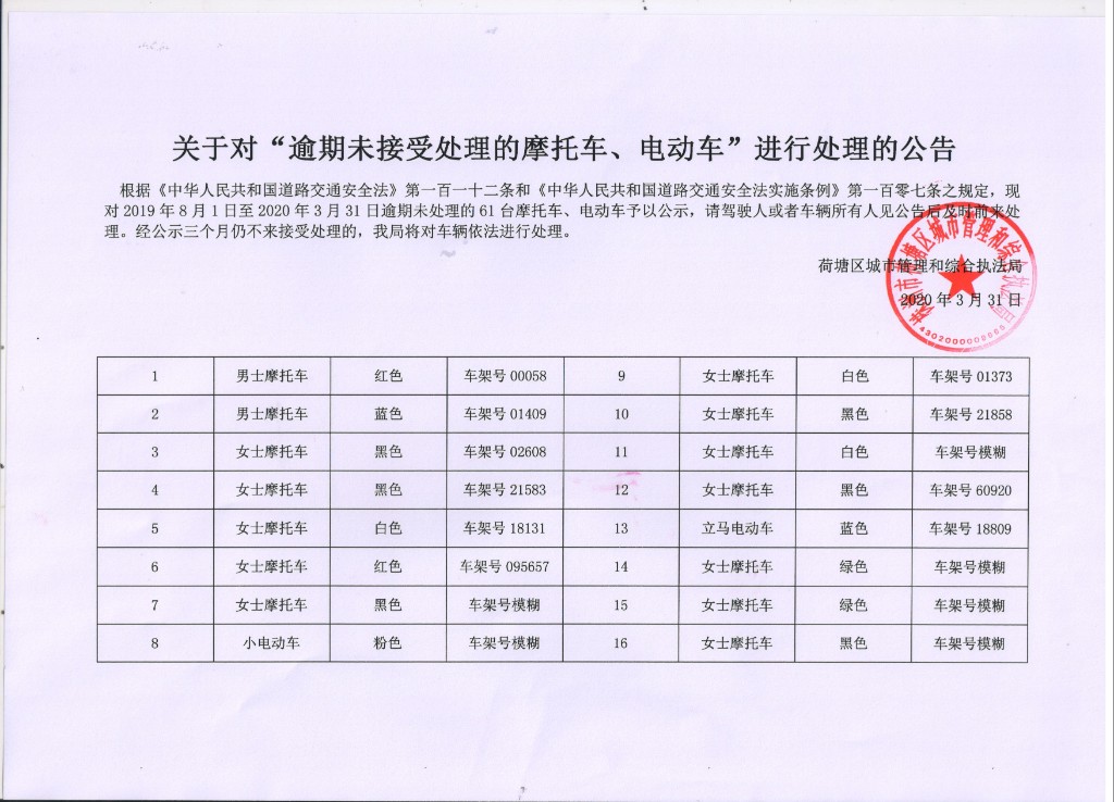 关于对“逾期未接受处理的摩托车、电动车”进行处理的公告