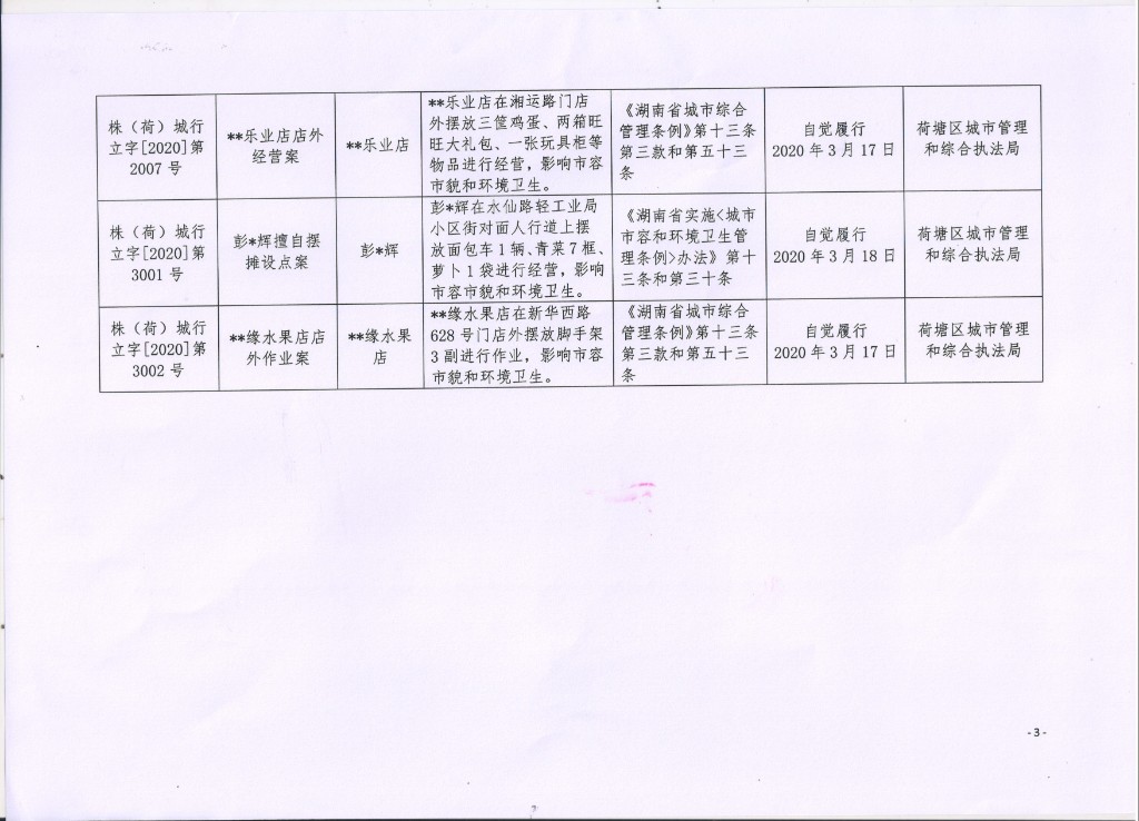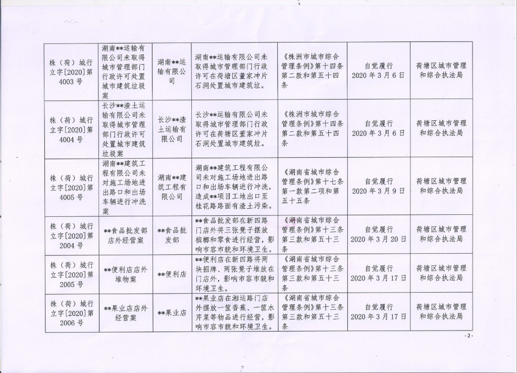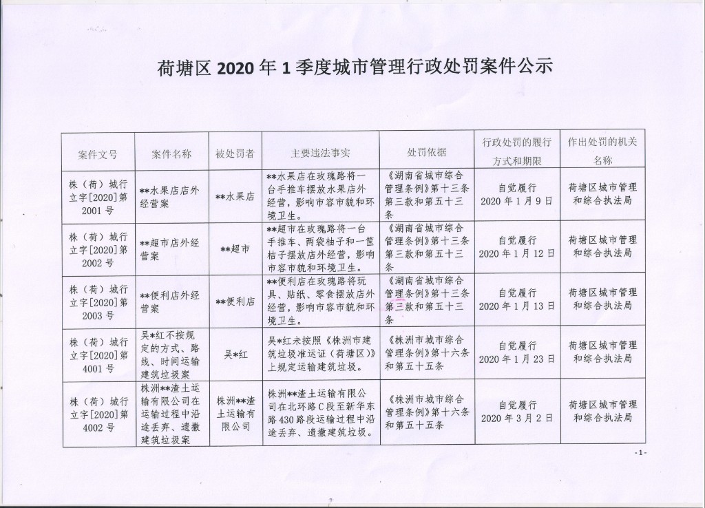 荷塘区2020年季1度城市管理行政处罚案件公示