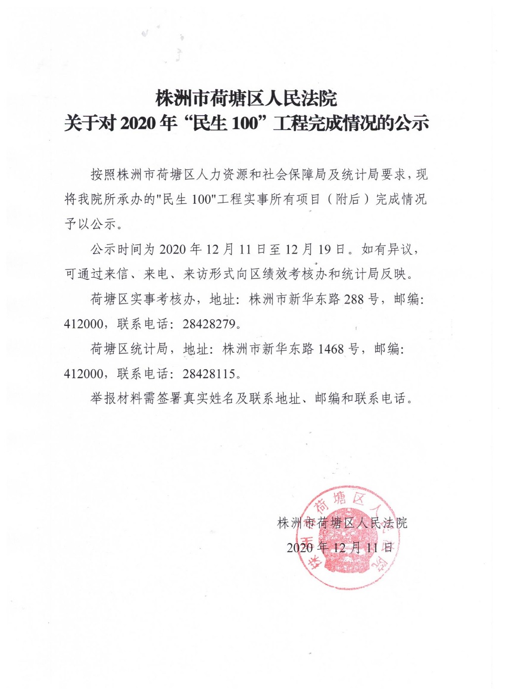 荷塘区人民法院关于对2020年“民生100”工程完成情况的公示