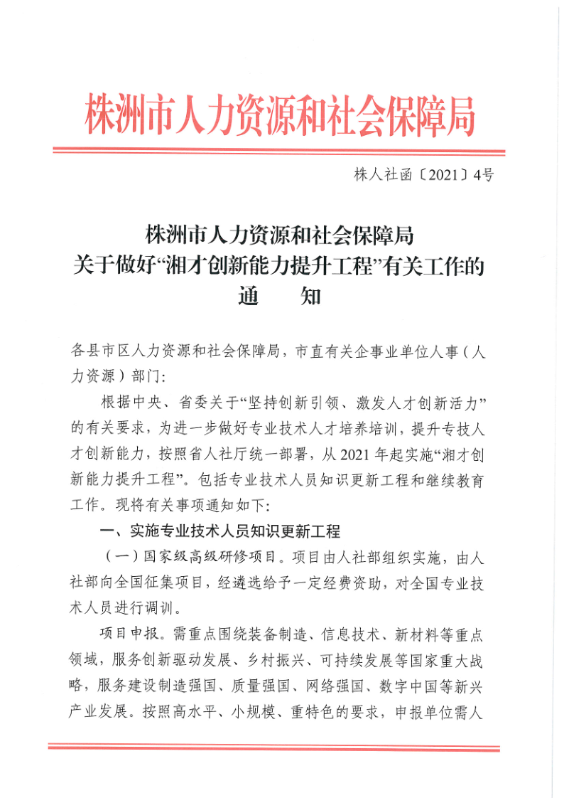 株人社函【2021】 4号关于做好“湘才创新能力提升工程”有关工作的通知
