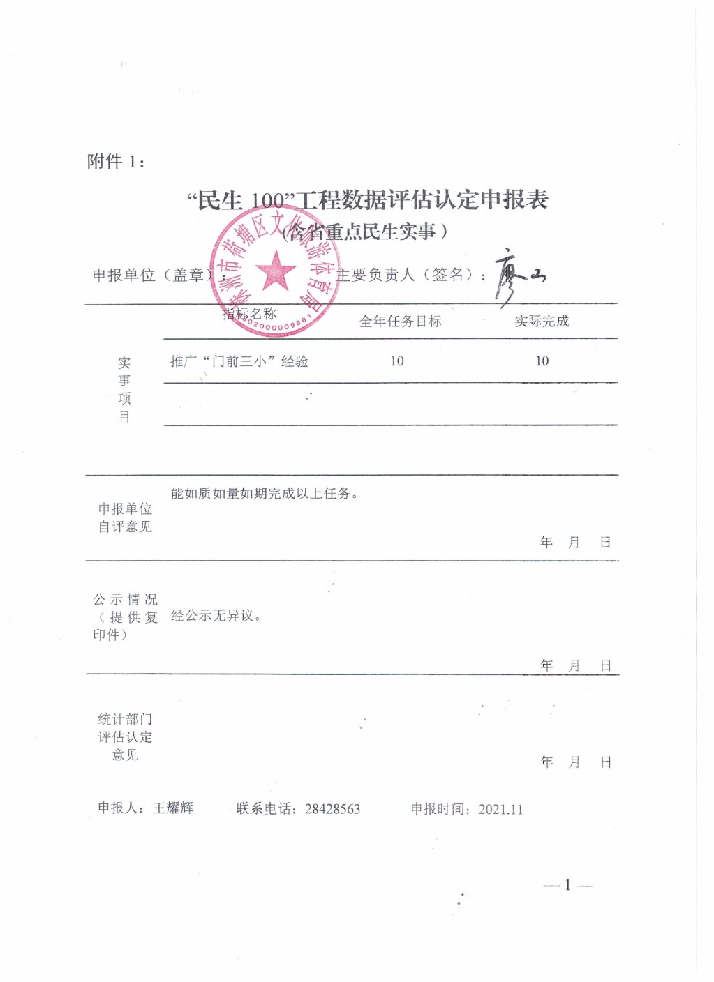 按照株洲市统计局《关于认真做好2021年全市“民生100”工程数据评估认定工作的通知》(株统计通〔2021〕74号)要求,我局已完成推广“门前三小”经验10家的任务,现将承办的2021年"民生100"工程项目完成情况予以公示。公示时间:2021年11月16日-11月22日,如有异议,可通过来信、来电、来访形式反映。联系电话:28428563地址:荷塘区区政府一号楼6楼