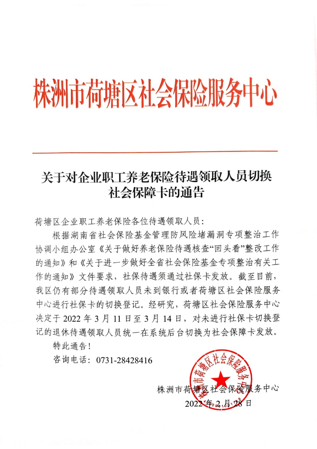 荷塘区社保中心关于对企业职工养老保险待遇领取人员切换社会保障卡的通告