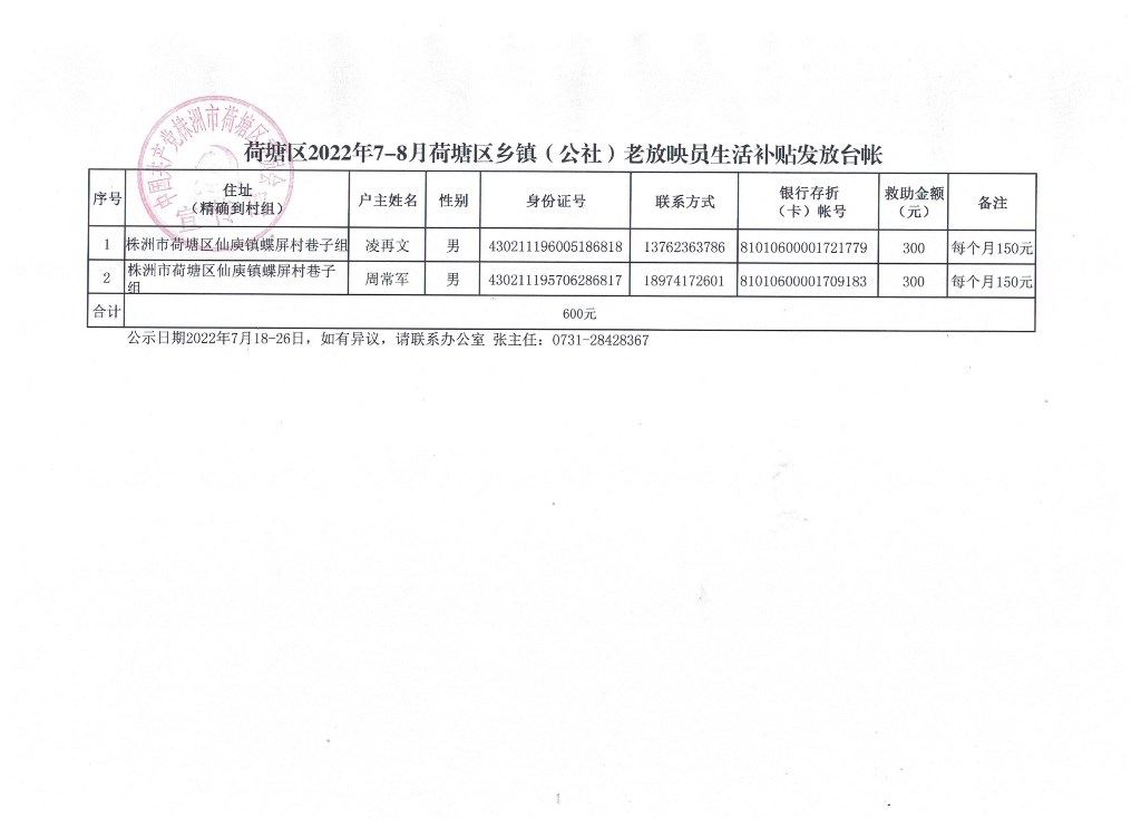 荷塘区2022年7-8月荷塘区乡镇(公社)老放映员生活补贴发放公示(网站)