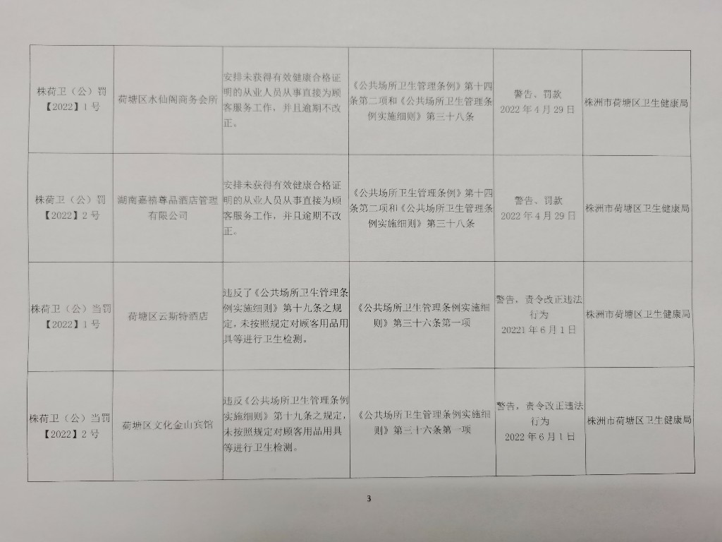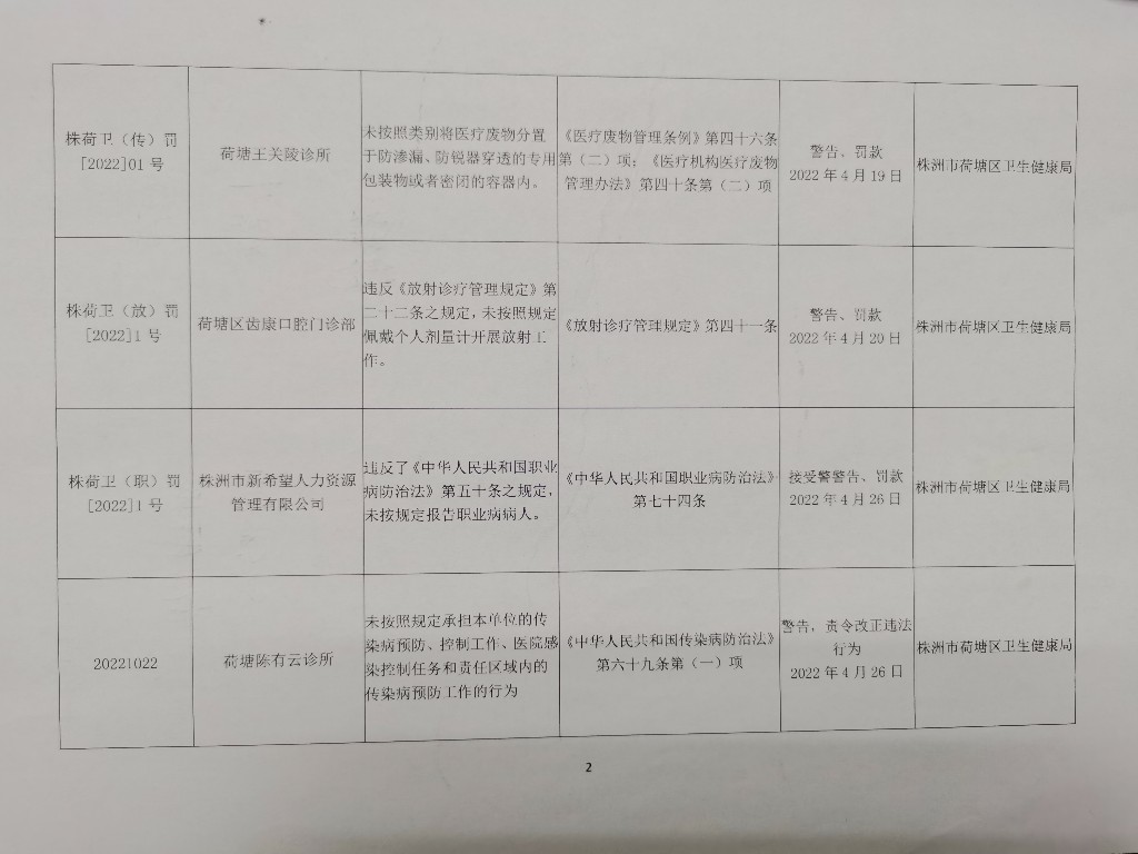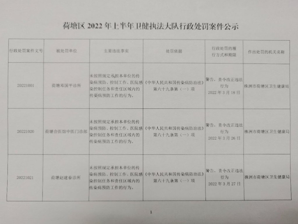 荷塘区卫健执法大队2022年上半年行政处罚案件公示