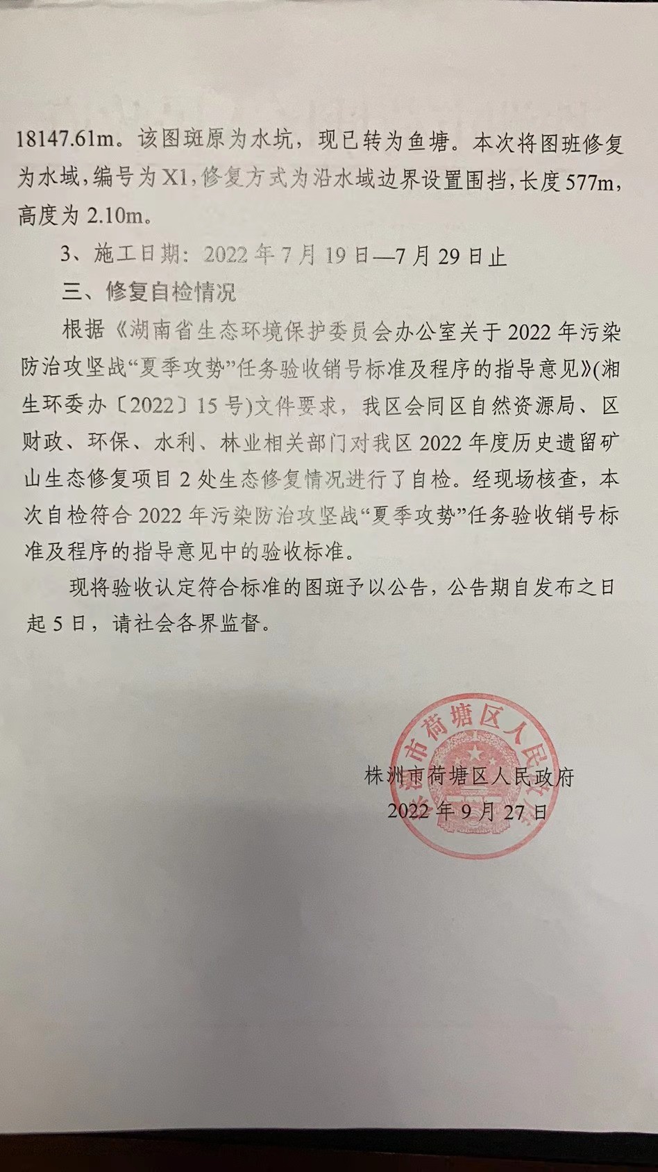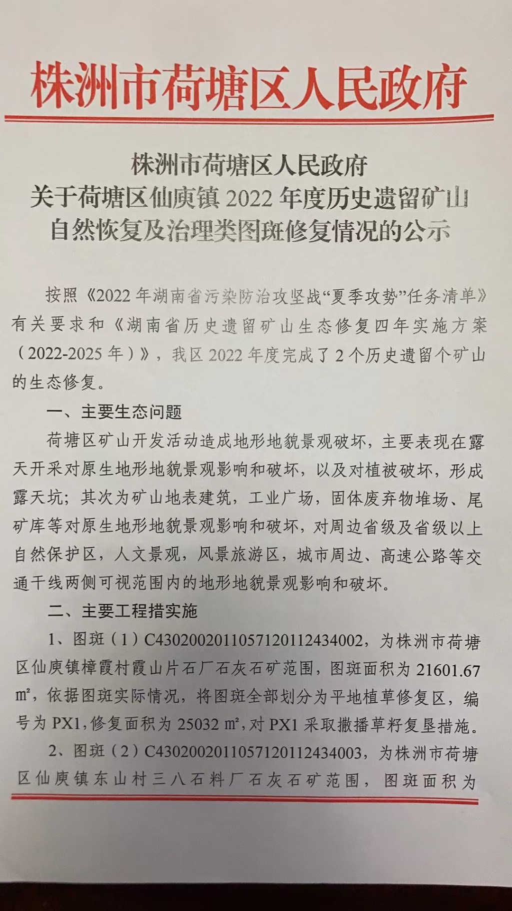 关于荷塘区仙庾镇2022年度历史遗留矿山自然恢复及治理类图斑修复情况的公示