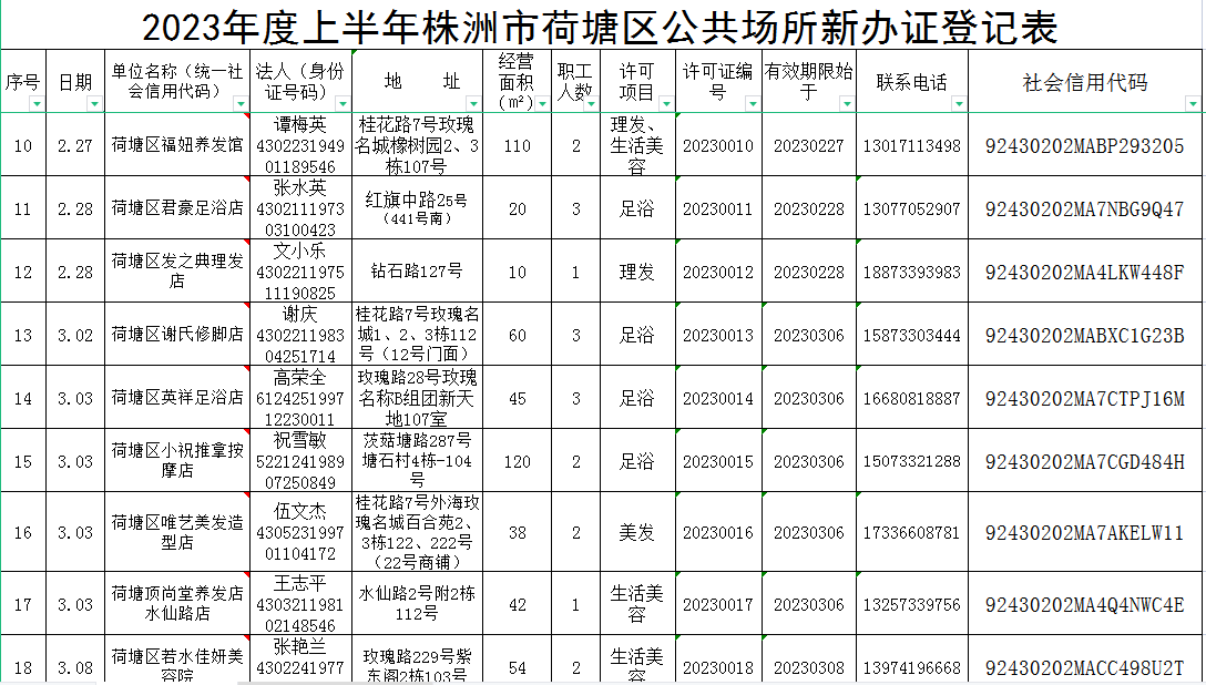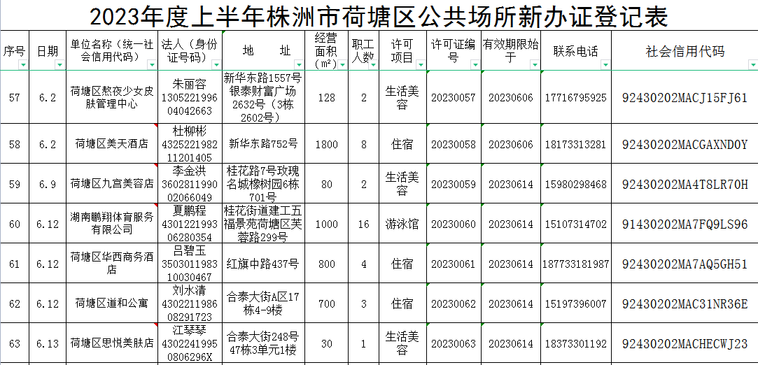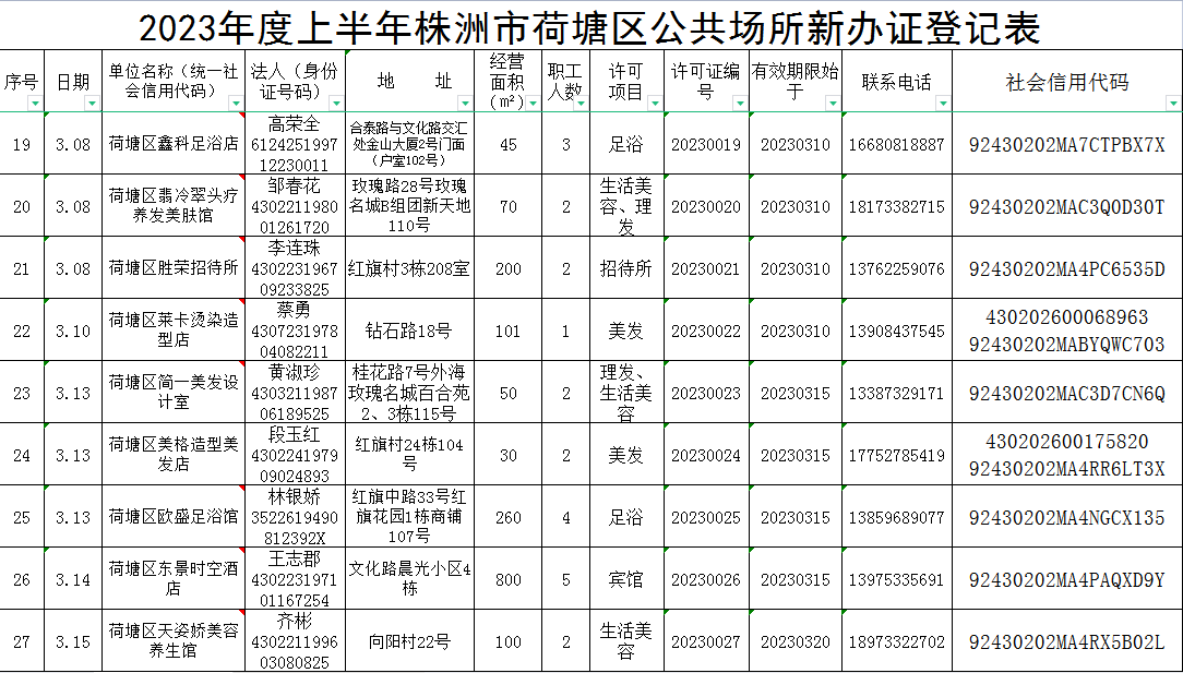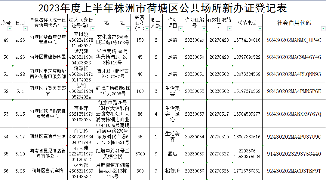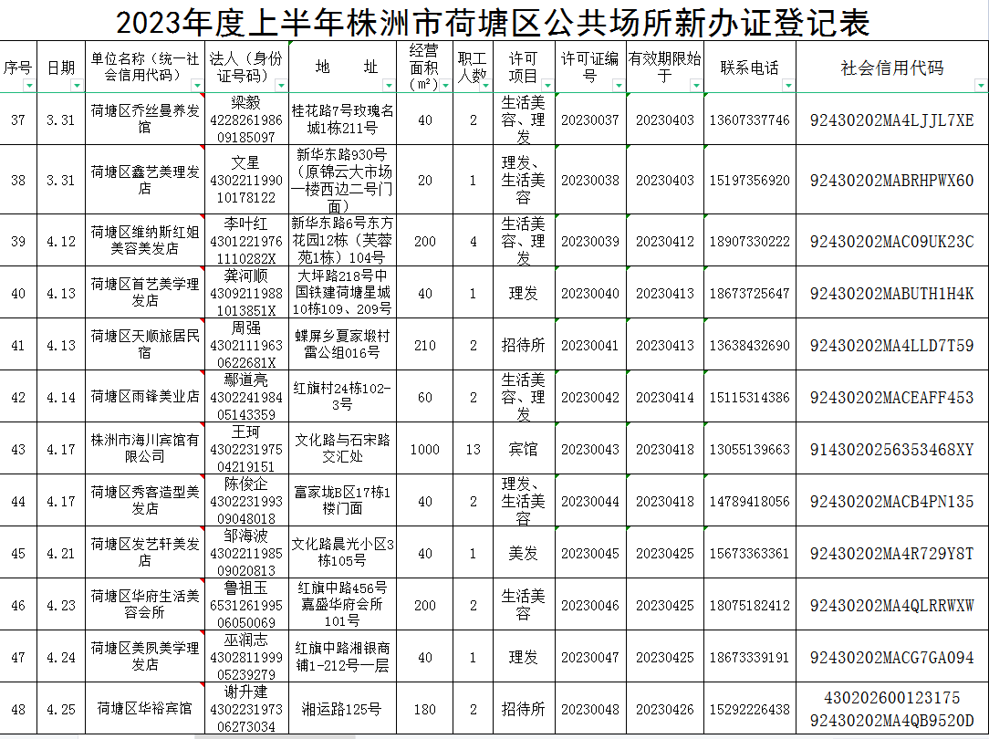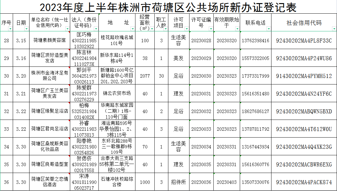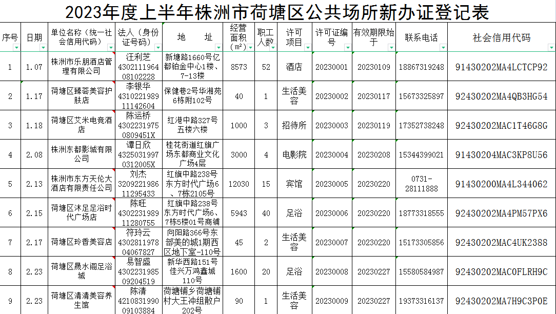 2023年度株洲市荷塘区上半年公共场所新办证公示