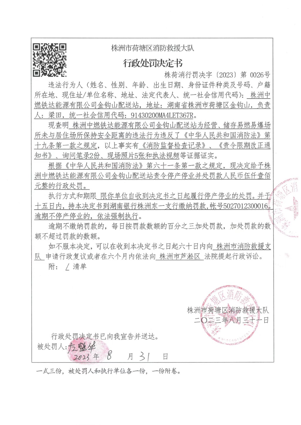 株洲市荷塘区消防救援大队 行政处罚决定书