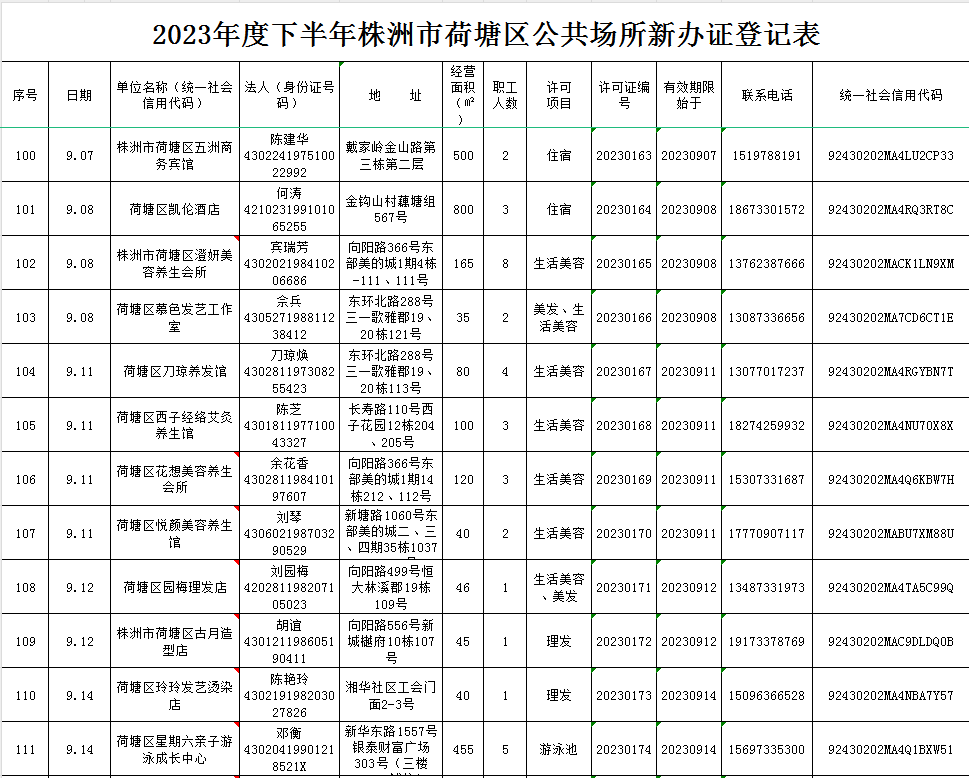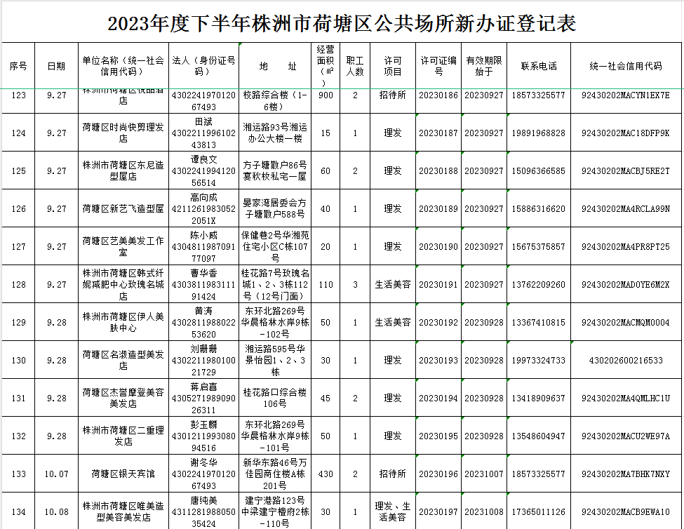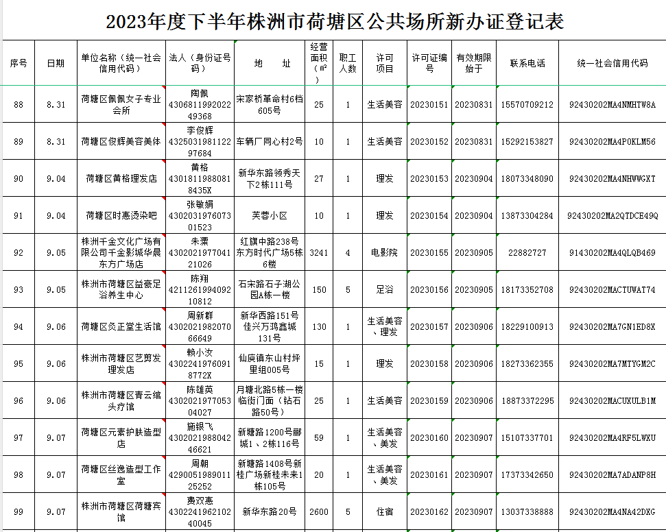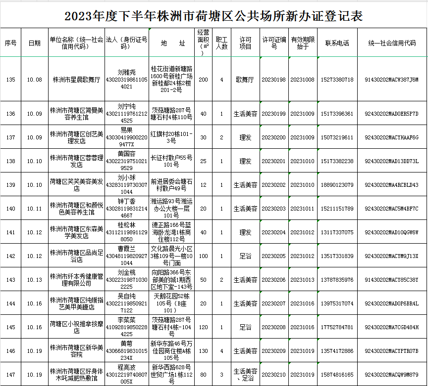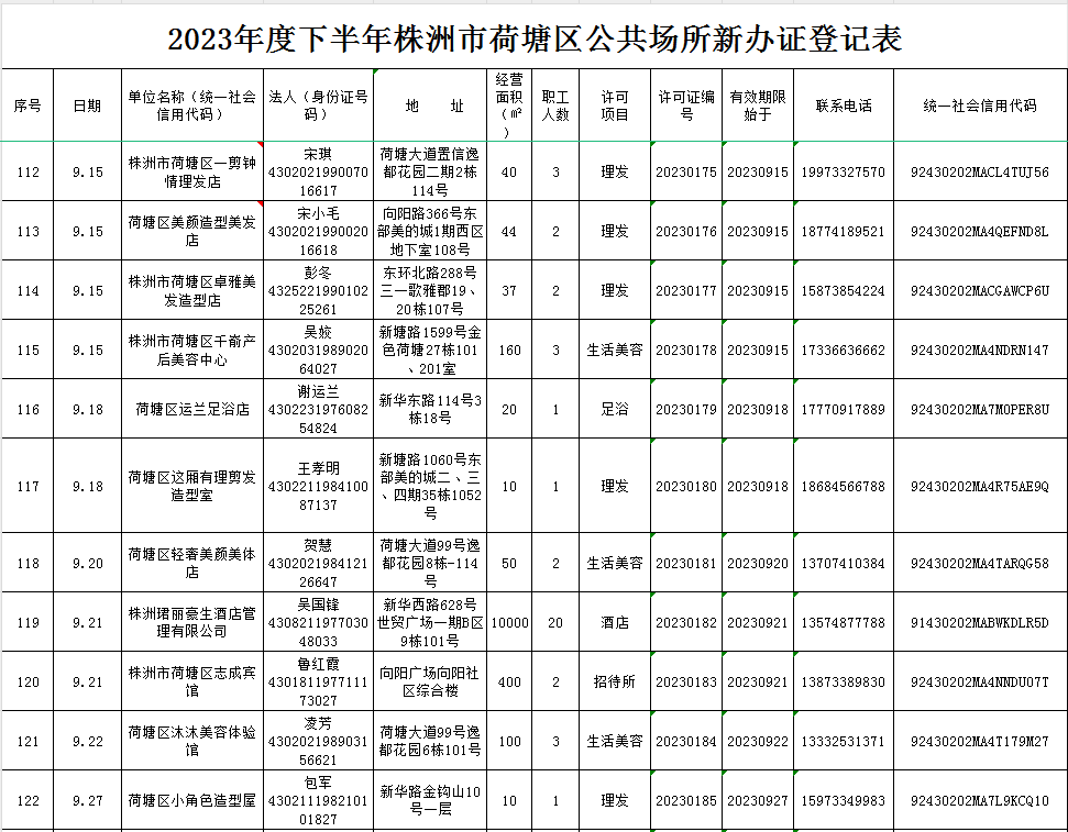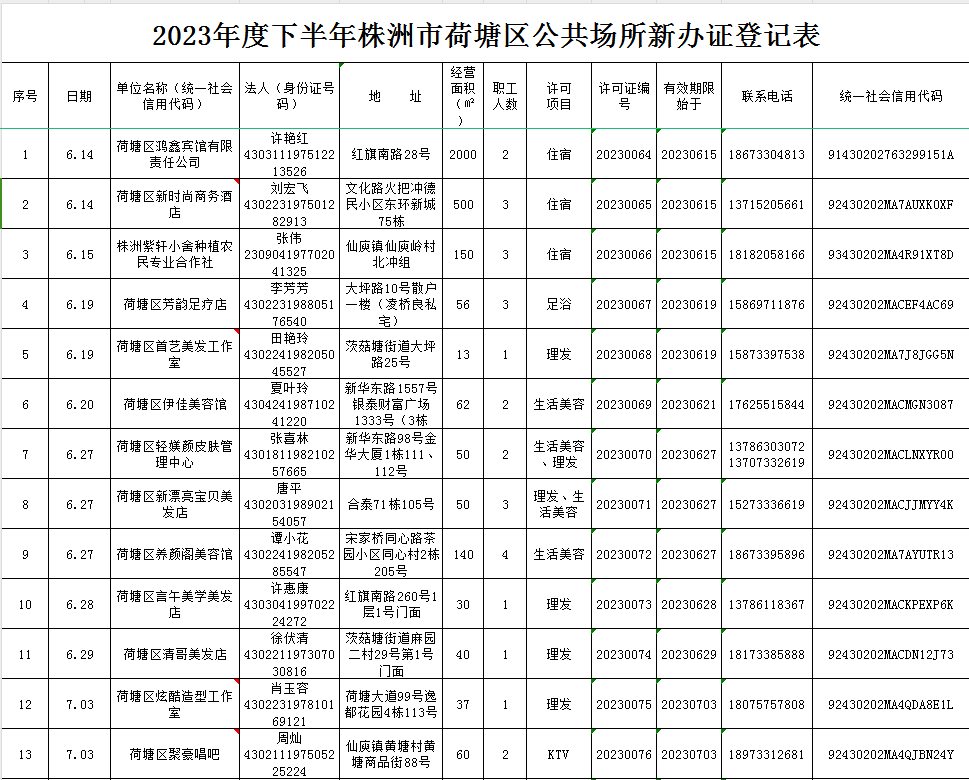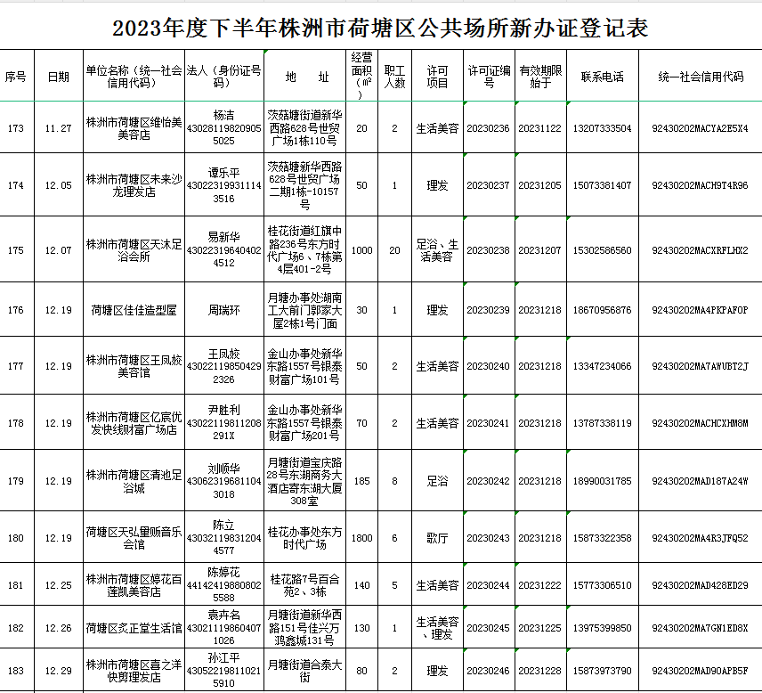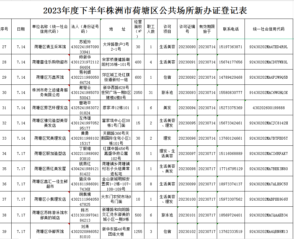 2023年度株洲市荷塘区下半年公共场所新办证公示
