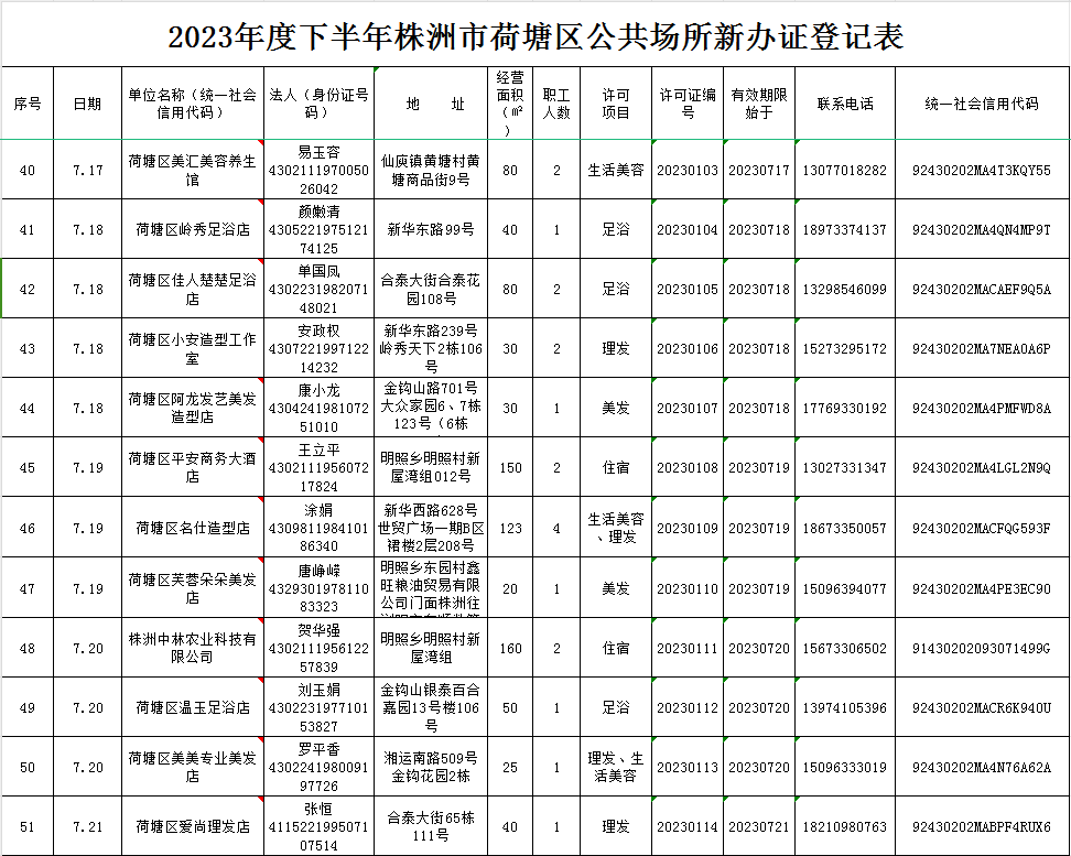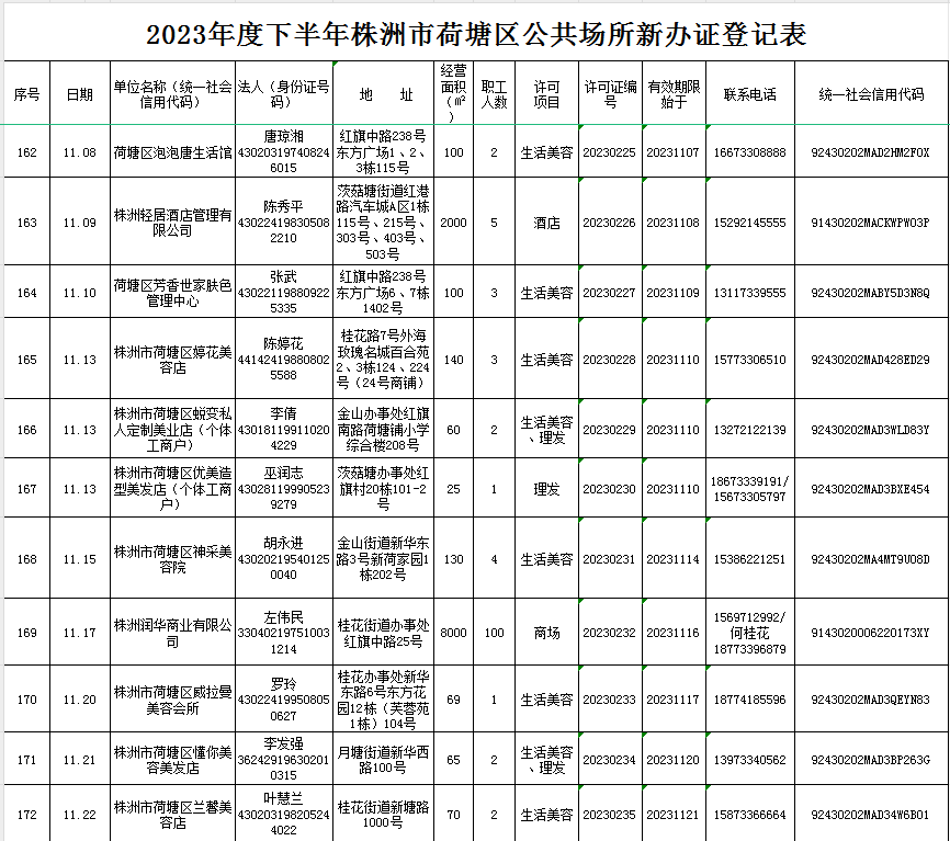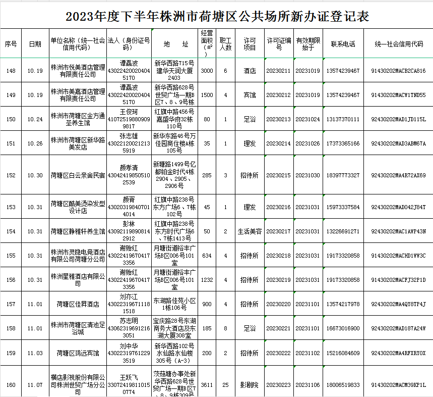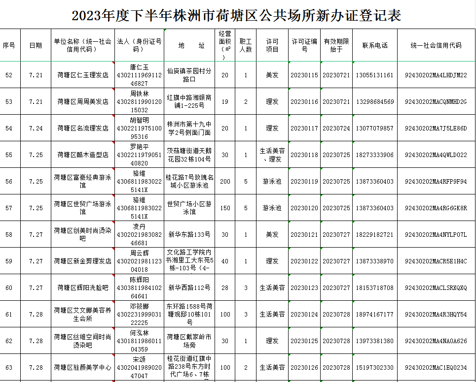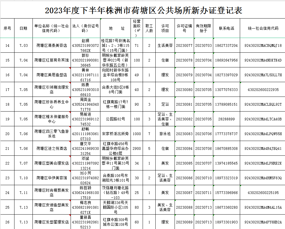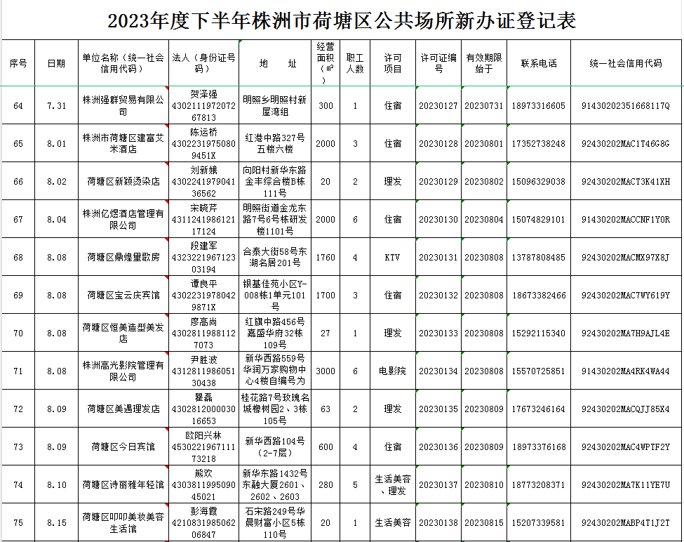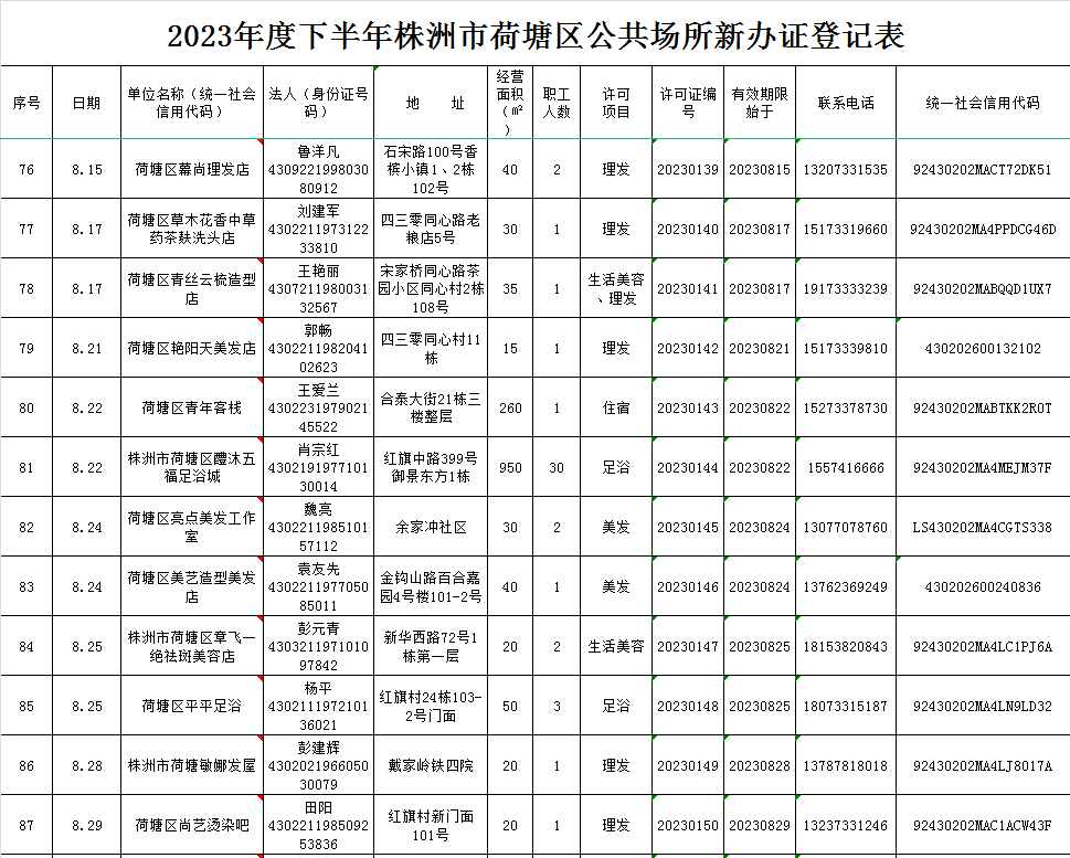 2023年度株洲市荷塘区下半年公共场所新办证公示