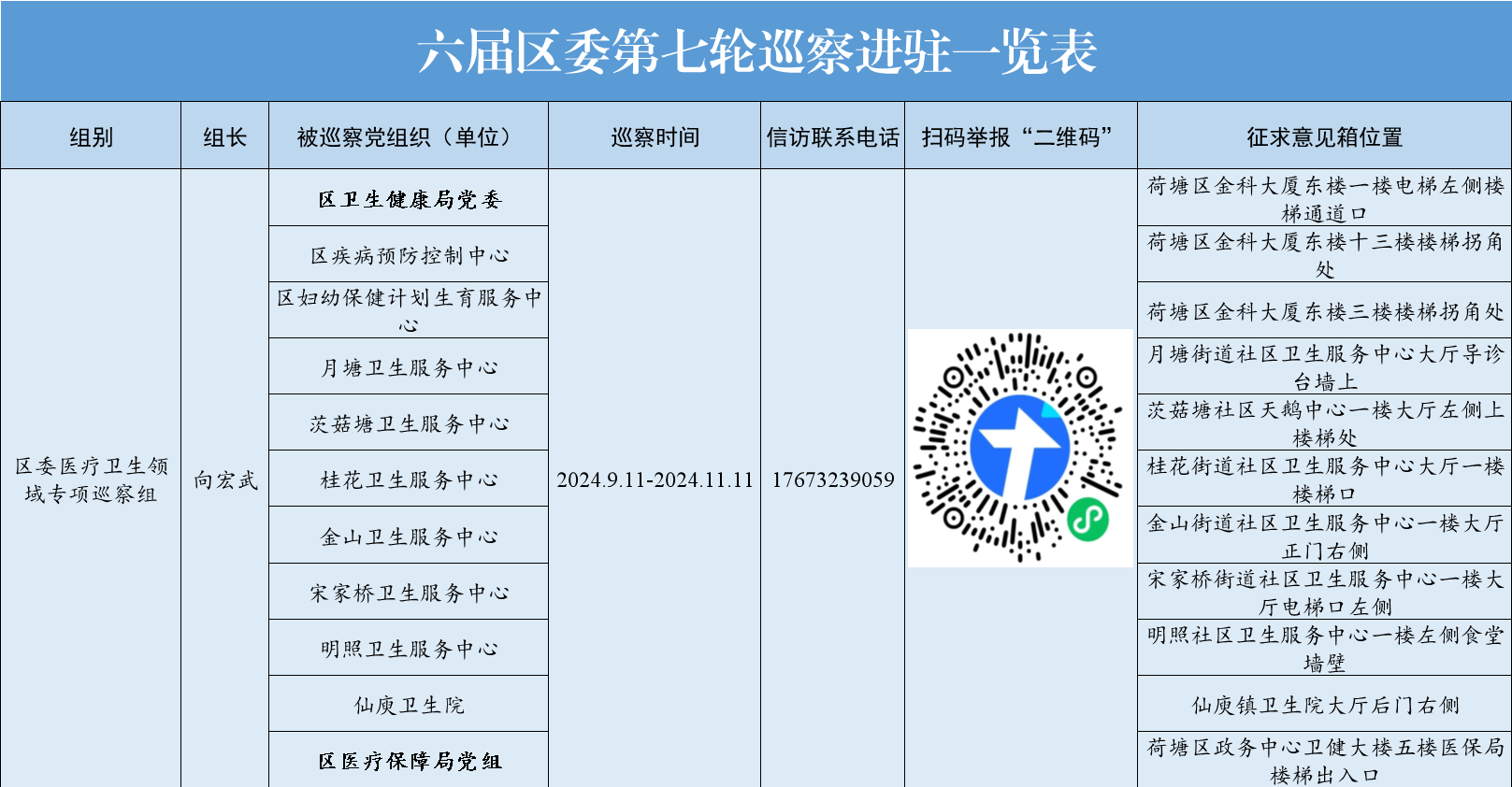 根据区委要求和巡察工作职责,巡察组主要受理反映被巡察党组织领导班子及班子成员的来信、来电、来访,重点是贯彻落实聚焦党的理论路线方针政策和党中央、省委、市委、区委关于医疗卫生领域的重大决策部署在基层贯彻落实情况,聚焦落实全面从严治党战略部署情况,聚焦贯彻落实新时代党的组织路线情况,聚焦落实巡视巡察、审计、主题教育等发现问题整改落实和成果运用情况,着力发现存在的问题。对有关个人诉求、涉法涉诉信访等不属于巡察受理范围的问题,将按规定交由有关部门处理。现将信访联系方式,扫码反映情况“二维码”以及征求意见箱位置予以公布。