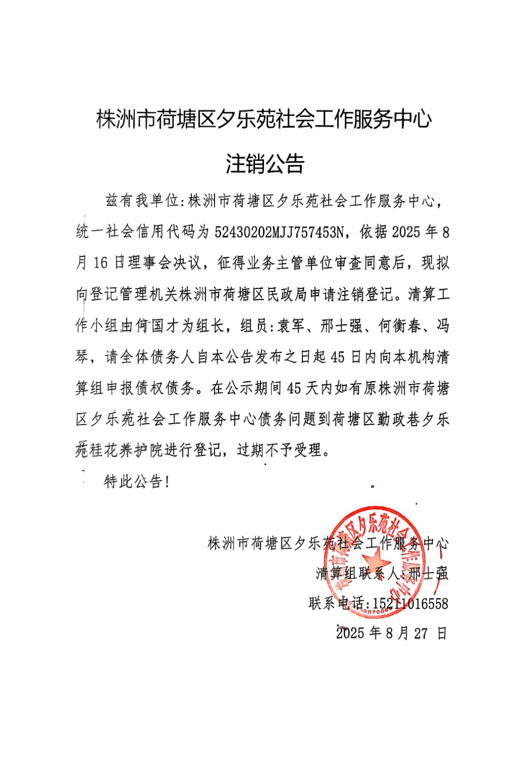 株洲市荷塘区夕乐苑社会工作服务中心注销公告