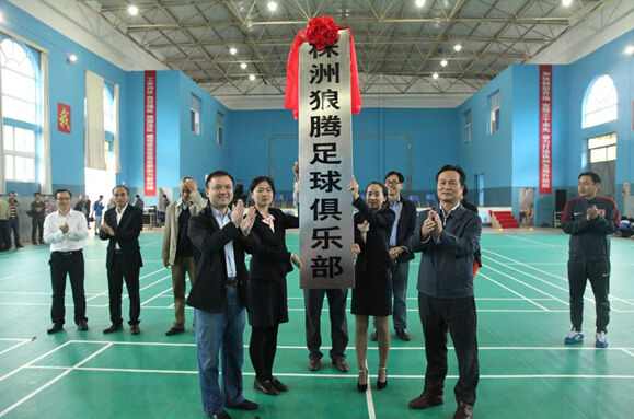 株洲市人民政府教育督导室主任督学夏立威(右一),荷塘区区委副书记、区长邬凌云(左一)为株洲狼腾足球俱乐部揭牌。