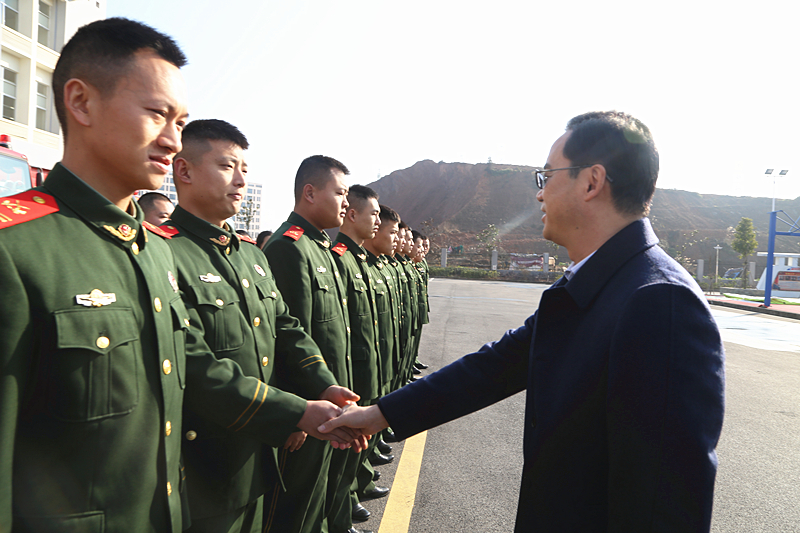 区委副书记、区长王利波与区消防大队官兵握手慰问