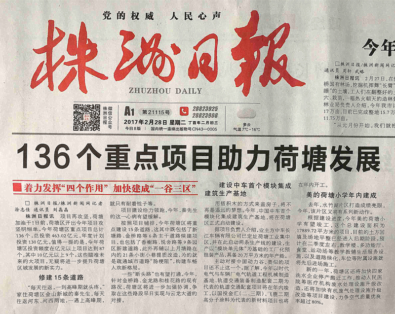2017年2月28日《株洲日报》头版头条刊发荷塘区项目建设重点报道