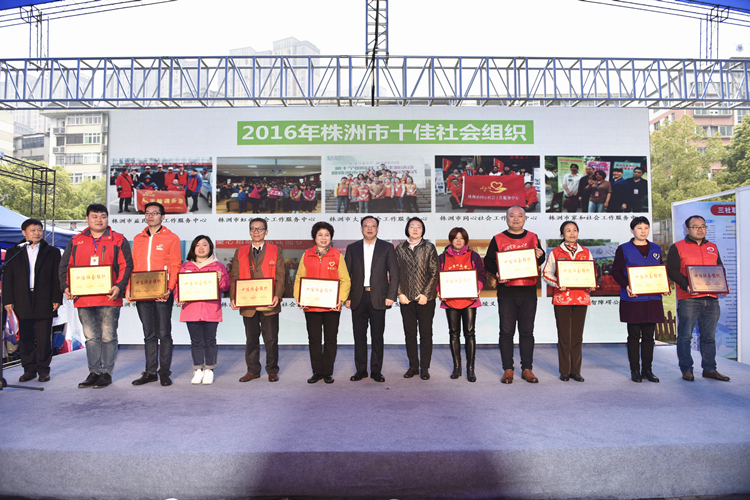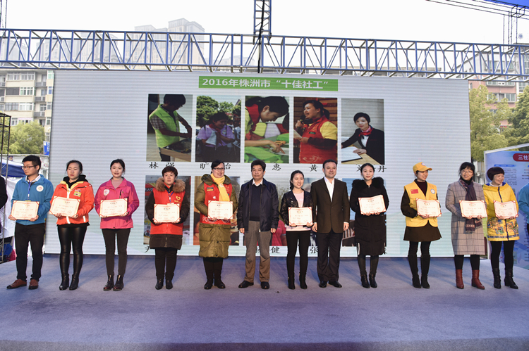株洲市民政局党组书记、局长马民杰,荷塘区委书记邬凌云为2016年株洲市十佳社工颁奖