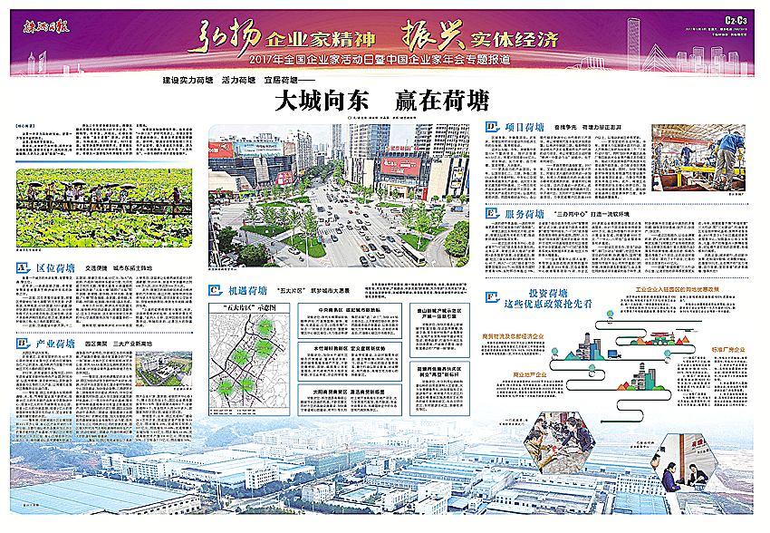 5月6日,《株洲日报》以整版在2017年全国企业家活动日暨中国企业家年会专题报道中全方位推介荷塘区