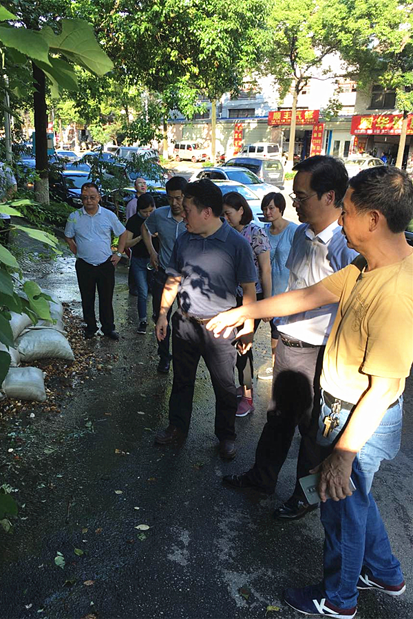 区委副书记赖晓智、副区长余鹏查看渗水点的应急处置措施