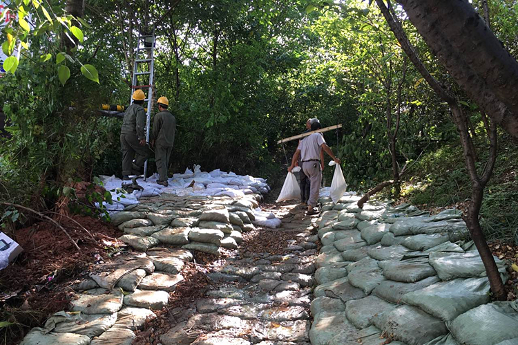 施工人员正在用卵石河沙压埋渗水处