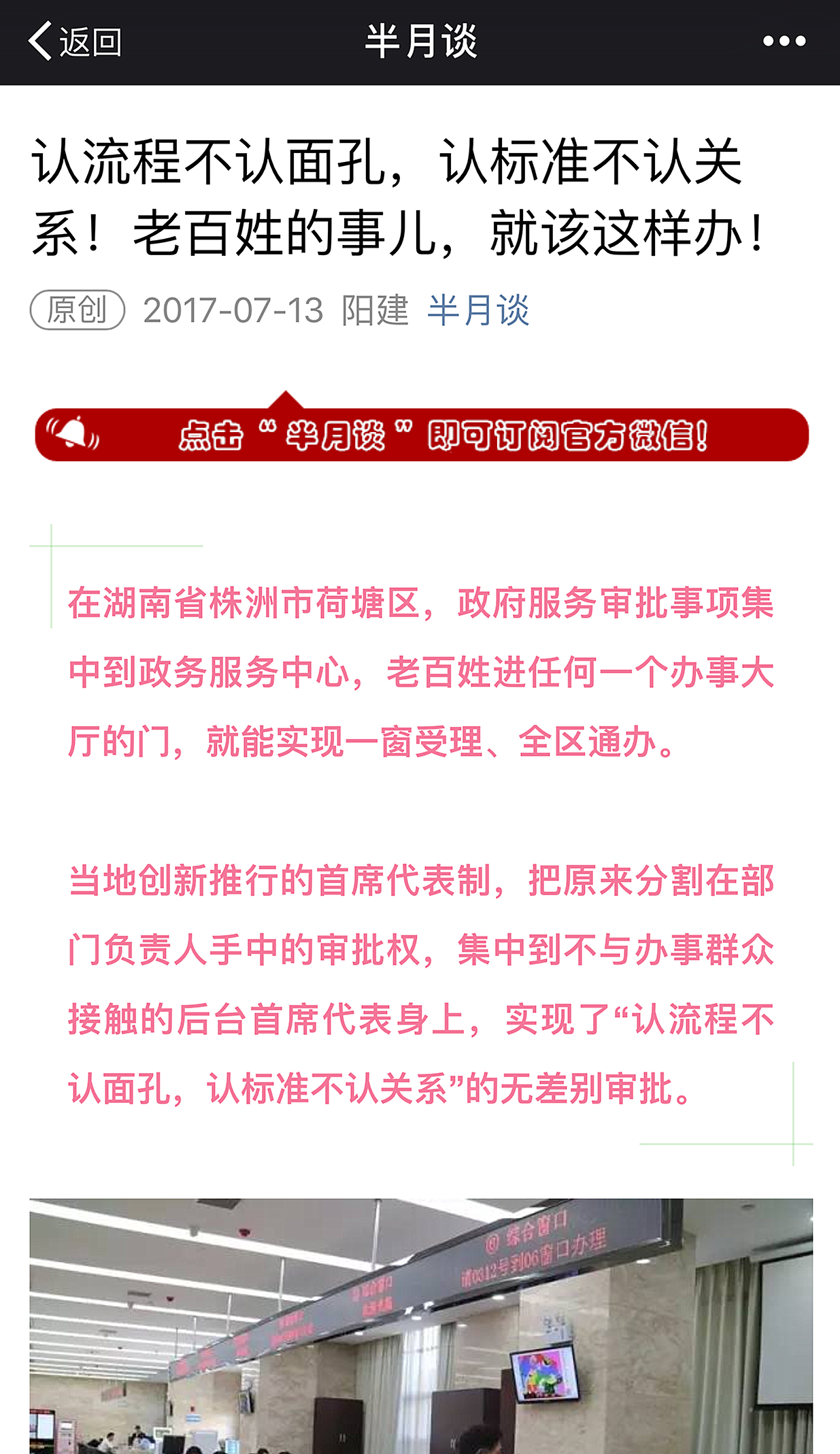 “中华第一刊”《半月谈》官微强力推介荷塘区政务服务改革截图