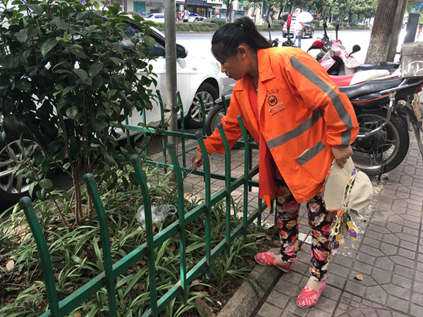 环卫工陈建平正在捡拾绿化带里的白色垃圾