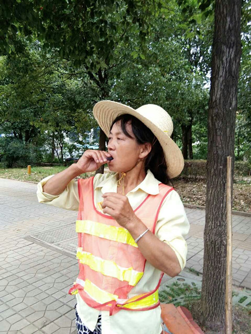 只见她一点一点把积水连带着路面上的垃圾清扫干净,中途不时停下来,靠着大竹扫把喘口气、擦把汗。