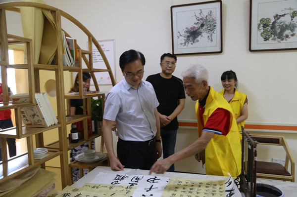 湘华社区养老服务中心的老人向王利波展示自己的书法作品