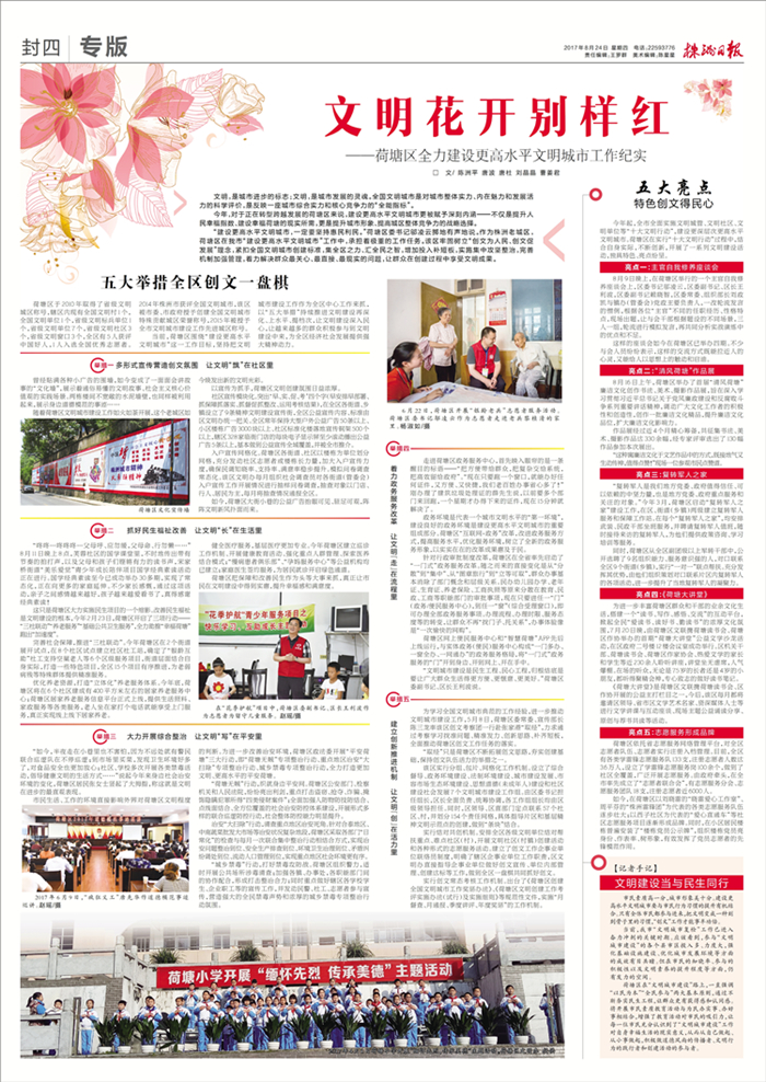 当前,荷塘区围绕“建设更高水平文明城市”这一工作目标,坚持把文明城市建设工作作为全区中心工作来抓,以“五大举措”持续推进文明建设再深化、上水平、提档次,让文明建设深入民心,让越来越多的群众积极参与到文明建设中来,为全区经济社会发展提供强大精神动力。