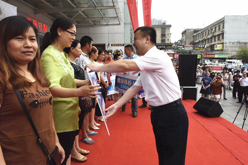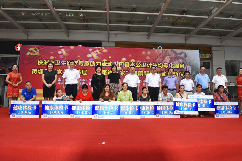 参会领导为10名月塘街道流动人口每人赠送了人民医院1000元健康体检卡