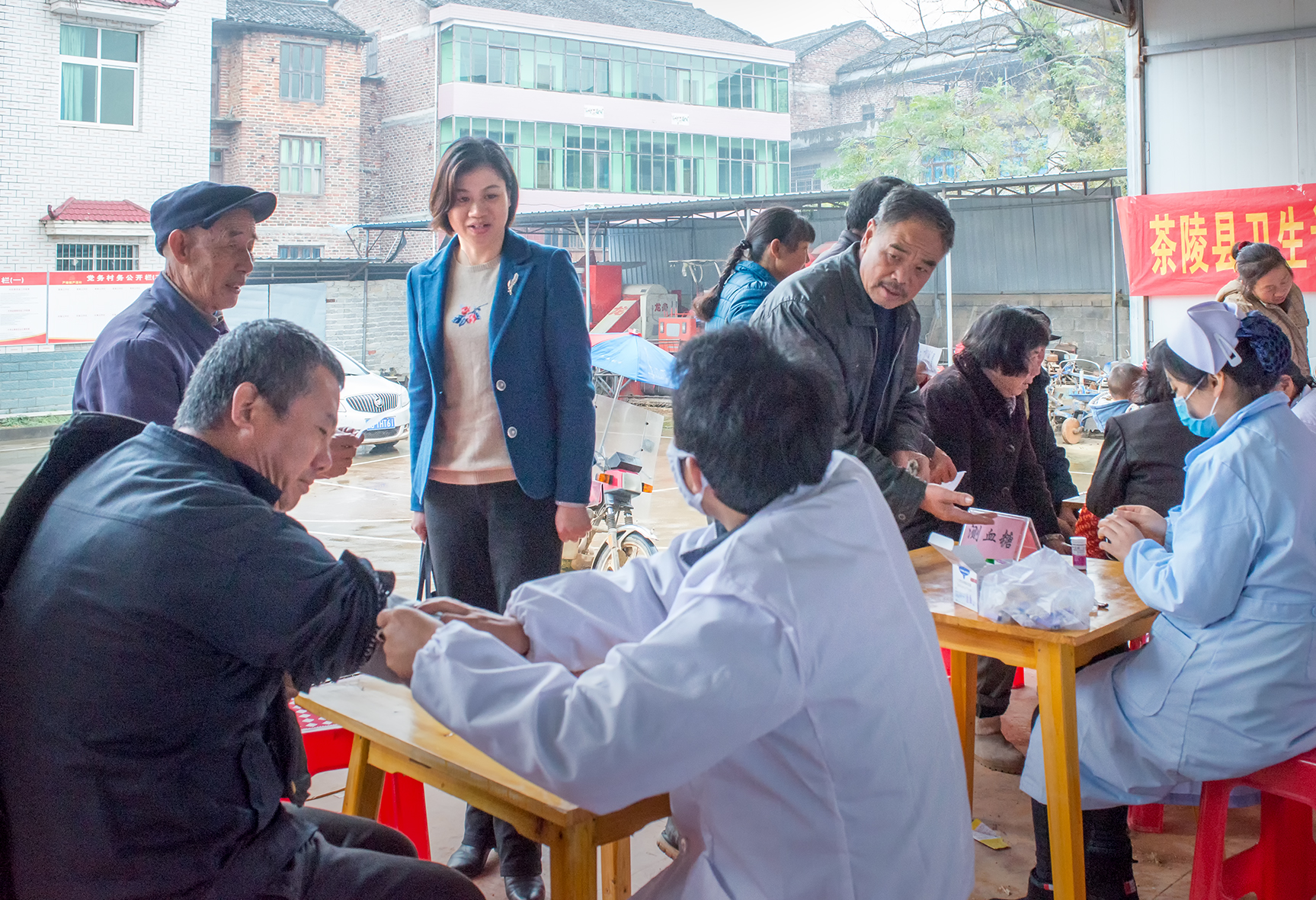 赖晓智与正在进行义诊的医护人员、村民交谈 杨淑如摄