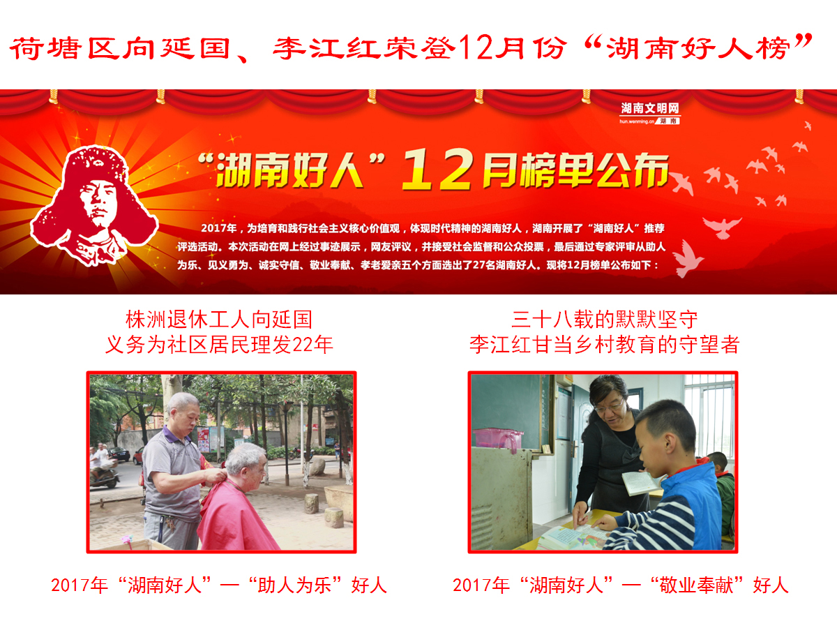 12月25日,2017年“湖南好人”12月榜单正式揭晓。经全省各县市区层层推荐、网上投票、群众评议和专家评审,27位群众身边好人光荣入选2017年12月“湖南好人榜”。其中,由区文明办推荐的向延国、李江红2人荣登榜单,分别获评“助人为乐”、“敬业奉献”类湖南好人。
