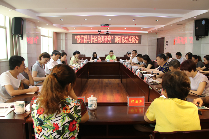 在8月9日召开的座谈会上,荷塘区委宣传部副部长唐波首先向黄教授一行介绍了荷塘区以微信为抓手,走好新时代网上群众路线的基本做法、主要成效以及启示和思考。随后,来自各镇、街道、社区和相关部门的代表以及优秀微信群主、盟主代表畅谈了通过微信创新社会治理的实际做法和工作体会。黄勇军教授从社会学层面剖析了微信对当今社会治理的影响,对荷塘区“盟主+群主”的微信群组管理模式高度赞许,并对此项工作提出了几点合理化建议:一是要加强系统培训,提高盟主群主与群众的沟通技巧,提升处理问题的能力,更好的利用微信渠道服务群众。二是要做好“权力清单”,明确微信群内问题处理的边界,为街道、社区工作人员解决群众问题提供依据和标准。三是尽量将工作内容进行体系化建构,逐渐形成群众通过微信反馈问题、政府通过微信进行社会治理和提供社会服务的良性循环。
