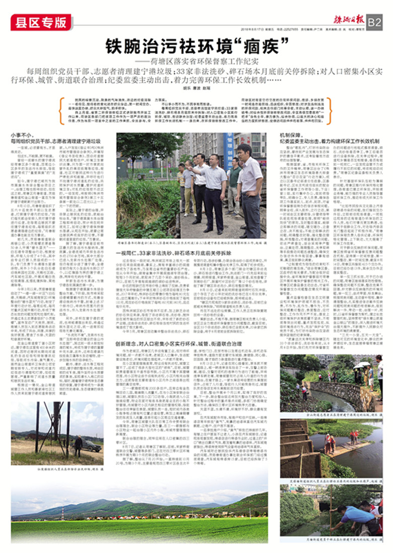 每周组织党员干部、志愿者清理建宁港垃圾;33家非法洗砂、碎石场本月底前关停拆除;对人口密集小区实行环保、城管、街道联合治理;纪委监委主动出击,着力完善环保工作长效机制……连日来,在环保督察整改工作中,荷塘区对需要立行立改的日常环保问题,街道、乡镇在第一时间走在最前线,迅速组织,全面整改;对涉及违例违法的环保问题,相关责任部门照单全收,主动认领,逐一办结销号;对综合性环保督察整改问题,全区各级党委政府“一把手”身先士卒,亲力亲为,综合协调,以最大的决心和最强的力度抓好整改,使信访问题件件有着落、件件有回复。