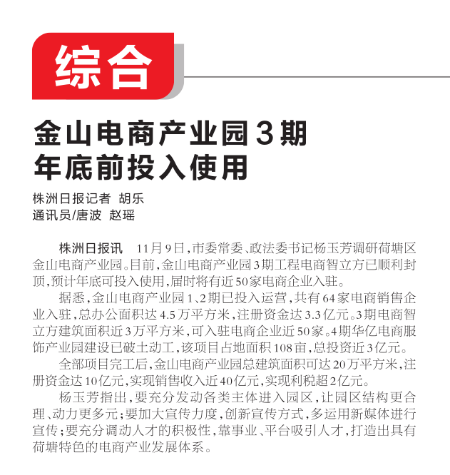 株洲日报讯 11月9日,市委常委、政法委书记杨玉芳调研荷塘区金山电商产业园。目前,金山电商产业园3期工程电商智立方已顺利封顶,预计年底可投入使用,届时将有近50家电商企业入驻。