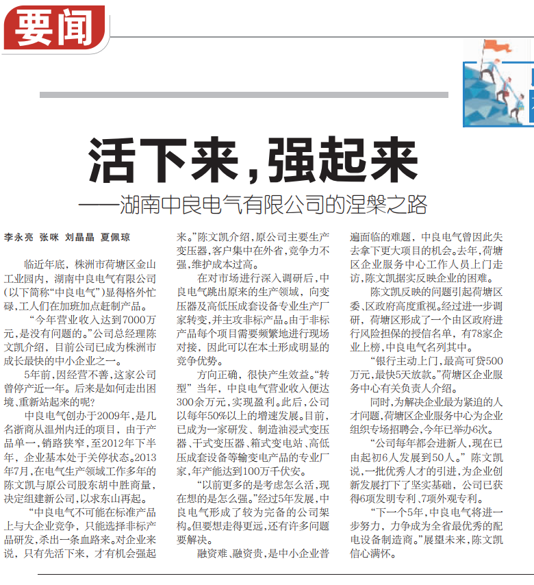 方向正确,很快产生效益。“转型”当年,中良电气营业收入便达300余万元,实现盈利。此后,公司以每年50%以上的增速发展。目前,已成为一家研发、制造油浸式变压器、干式变压器、箱式变电站、高低压成套设备等输变电产品的专业厂家,年产能达到100万千伏安。