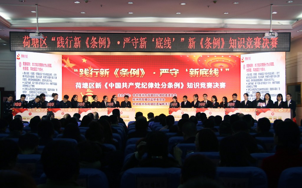 随后,荷塘区开展了“践行新条例,严守新底线”——荷塘区新《中国共产党纪律处分条例》知识竞赛决赛,来自荷塘公安分局党委,区教育局、区直机关工委、金山工业园、桂花街道、茨菇塘街道、月塘街道、合泰管理办党工委的8支代表队参与角逐。比赛以必答、抢答、比划猜词等形式,全面考察参赛干部对新《条例》的学习情况。最终月塘街道党工委代表队脱颖而出,以190分获得一等奖。