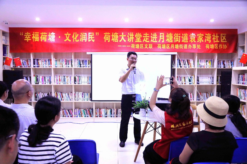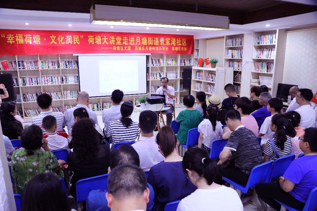 7月16日,由荷塘区文联、荷塘区月塘街道办事处联合主办,荷塘区读书会、荷塘区袁家湾社区及荷塘区作家协会共同承办的2019年“幸福荷塘•文化润民”荷塘大讲堂第15期文学讲座活动走进区袁家湾社区。荷塘区委常委、宣传部长田灿及区委宣传部文明办、区月塘街道党政领导、区作协一行人均以书友身份参加活动与学习交流。活动由荷塘区文联主席、荷塘读书会会长蔡灵敏主持,
