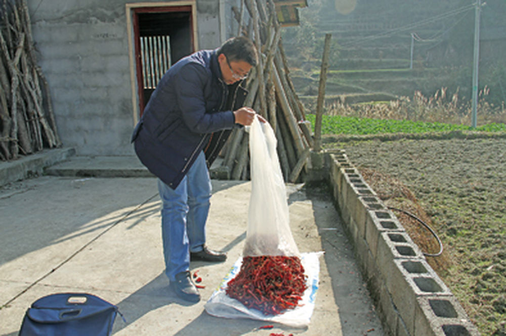 ▲杨运大到贫困户家里走访,帮助晒辣椒。