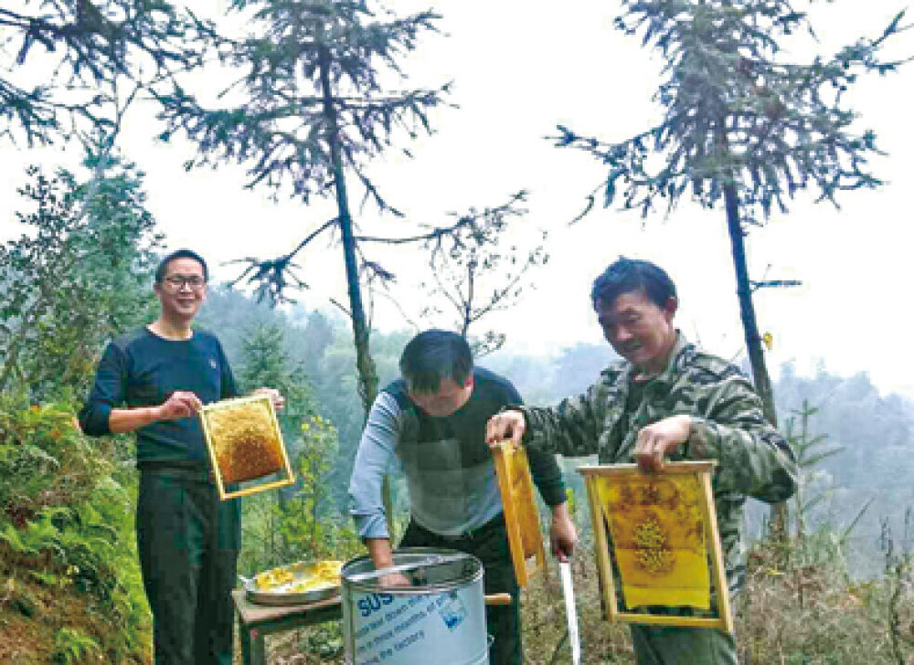 ▲邓文慧(左一)帮贫困户收蜂蜜。