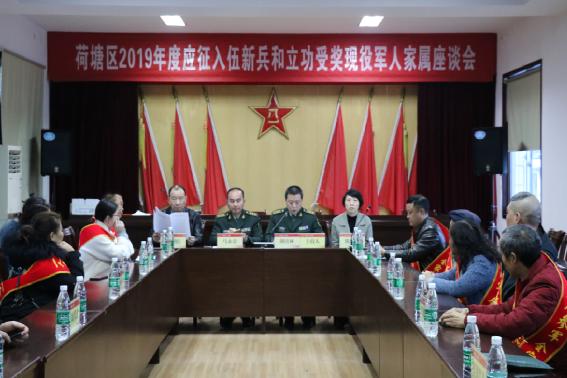 为表彰奖励我区军人军属为国防建设的突出贡献,激励现役官兵扎根部队建功立业,激发广大适龄青年积极应征入伍。1月9日,荷塘区退役军人事务局组织召开2019年度应征入伍新兵及立功受奖现役军人军属座谈会。区委常委、人武部部长马永章,区人民政府副区长、公安荷塘分局局长黄团结出席座谈会,区人武部政委胡喜林主持。
