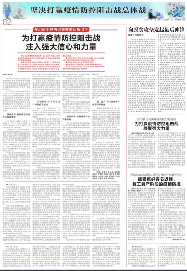 “疫情发生以来,习近平总书记多次作出重要指示批示,深入基层调研指导疫情防控工作,慰问奋战在一线的医务工作者,充分体现了以习近平同志为核心的党中央对人民群众生命安全和身体健康的高度重视。”省卫健委主任陈小春说,当前,湖南省疫情防控工作正处于关键时期,疫情输入和扩散蔓延势头得到控制,趋势向好。下一步,我们将做好复工复产后疫情防控工作,加强诊断和治疗,统筹保障防疫物资,加强科普宣传和政策解读,为决胜全面建成小康社会打下坚实的健康基础。