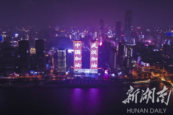 (2月8日,元宵节,长沙市开福区万达广场高楼外墙亮起“武汉加油,中国加油”、“同舟共济,同江同湖”等字样的标语。湖南日报·新湖南客户端记者 辜鹏博 摄)